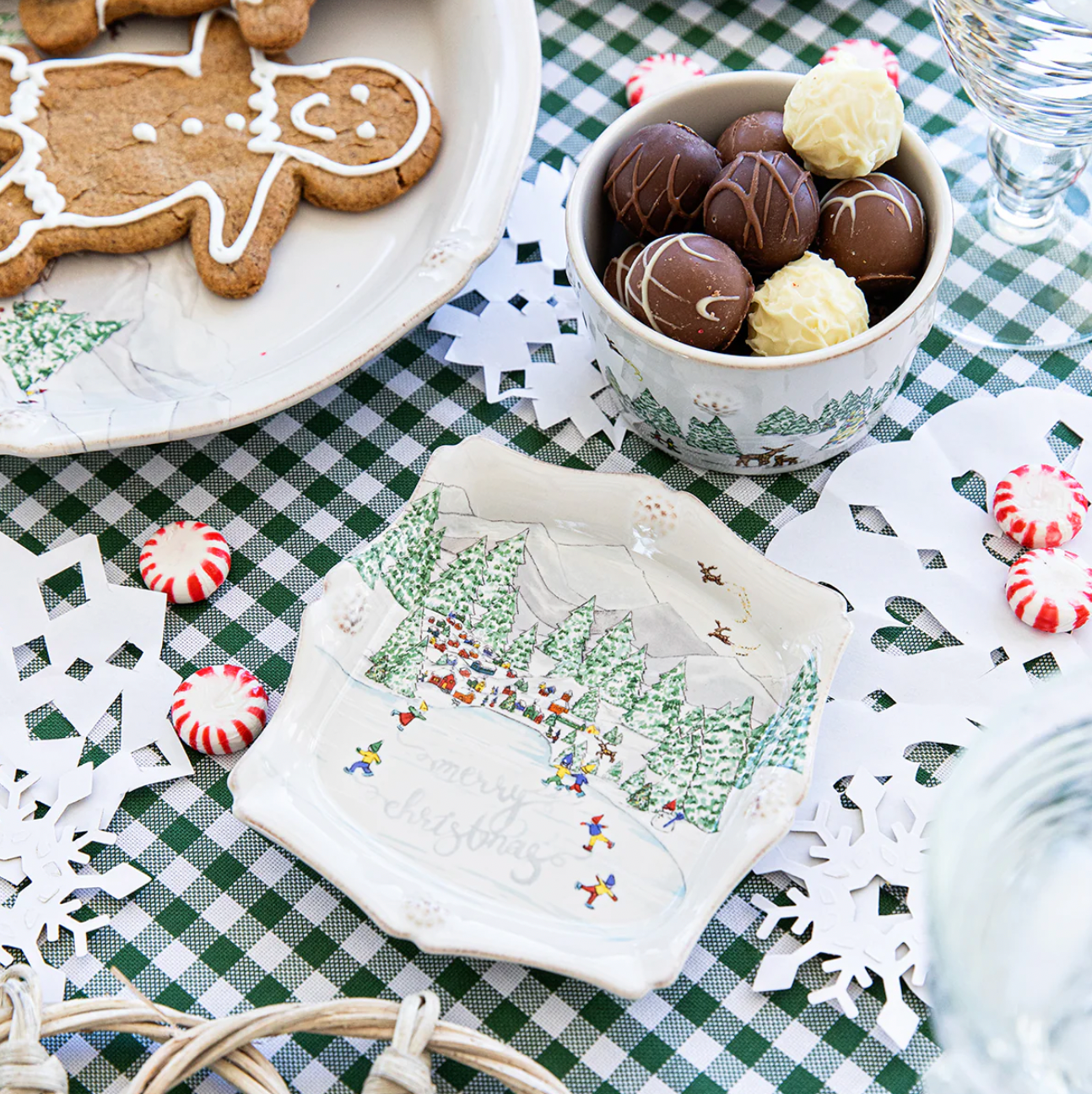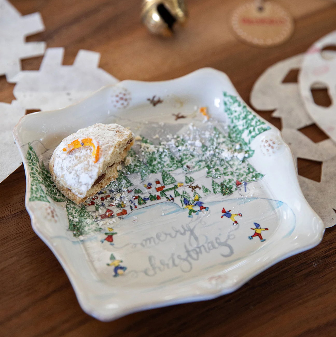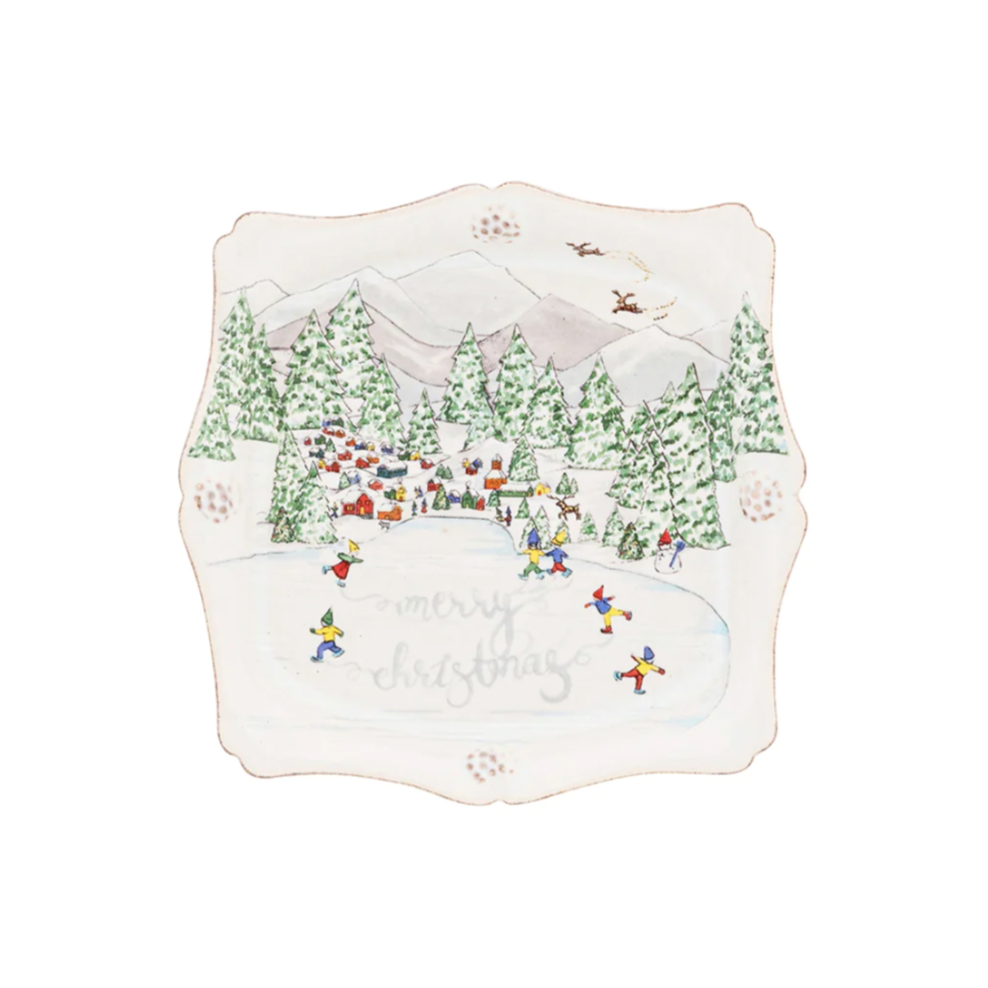 The perfect trinket tray for all your baubles or favorite petite sweets, place one in every room - and then be sure to stock up to give as gifts to everyone on your list! With a delicate scalloped silhouette dotted with our signature berries, we've expanded upon our beloved North Pole illustrations to show some elves enjoying an afternoon of ice skating and spelling out a cheery message to wish you a "Merry Christmas!"
