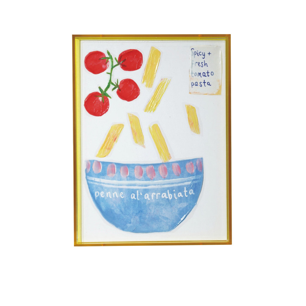 Bring Italian culinary charm to your kitchen with this striking "Penne Al'Arrabiata" wall art. Featuring a vibrant yellow acrylic box frame, this 16-inch tall piece showcases a beautifully rendered canvas depicting a classic pasta dish complete with fresh tomatoes and a ceramic bowl.