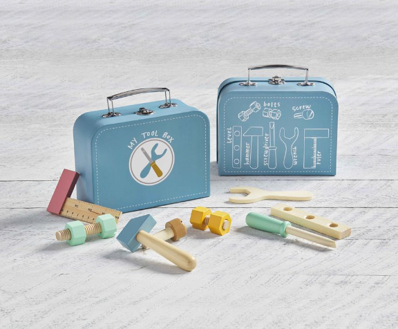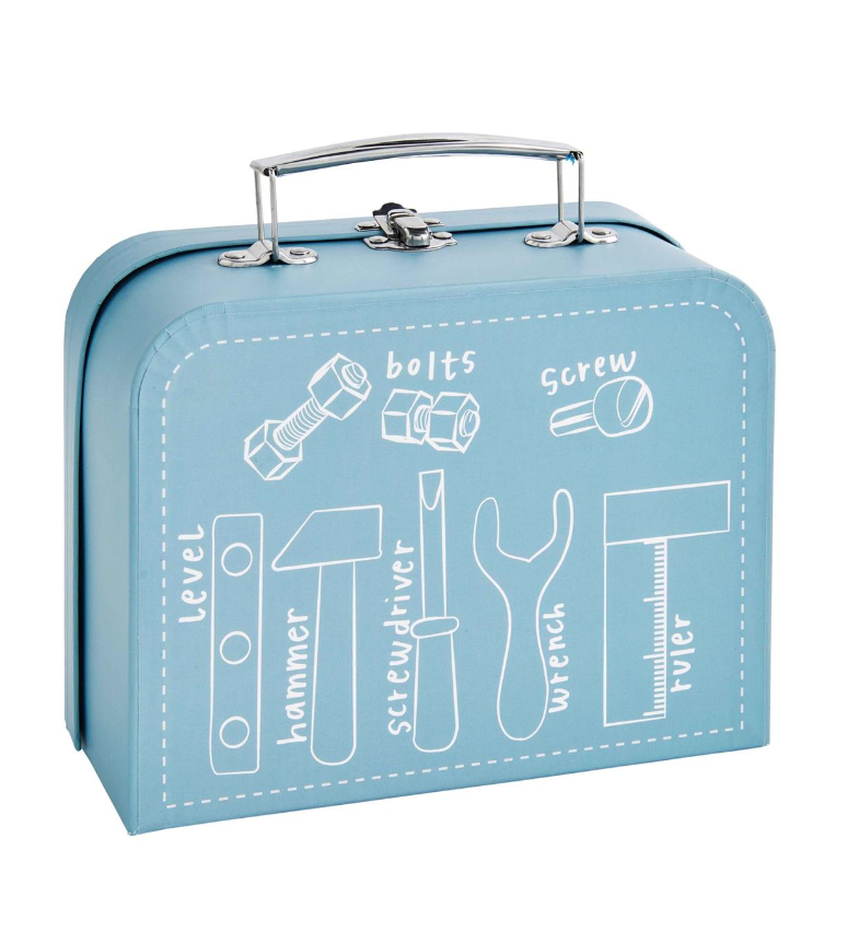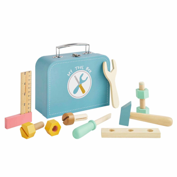 Comes as an 8-piece set. Suitcase holds wooden bolts, screw, level, hammer, screwdriver, wrench and ruler. Ages 3+.