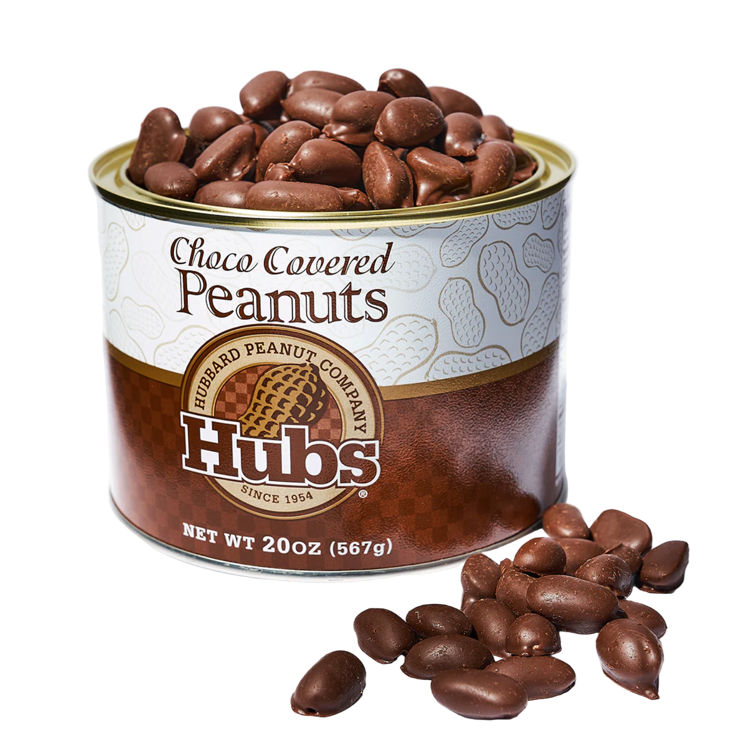 For the lover of chocolate covered peanuts, this is a sweet treat. Our delicious Hubs salted peanuts are dipped and lightly coated with a satisfying chocolate flavor that doesn't overpower. You won't have trouble finding the peanut in Hubs choco covered peanuts. We use the same super extra-large Virginia peanuts for the perfect combination of nuttiness and sweetness. Packaged in reusable vacuum tins, Hubs choco covered peanuts will make great gifts.