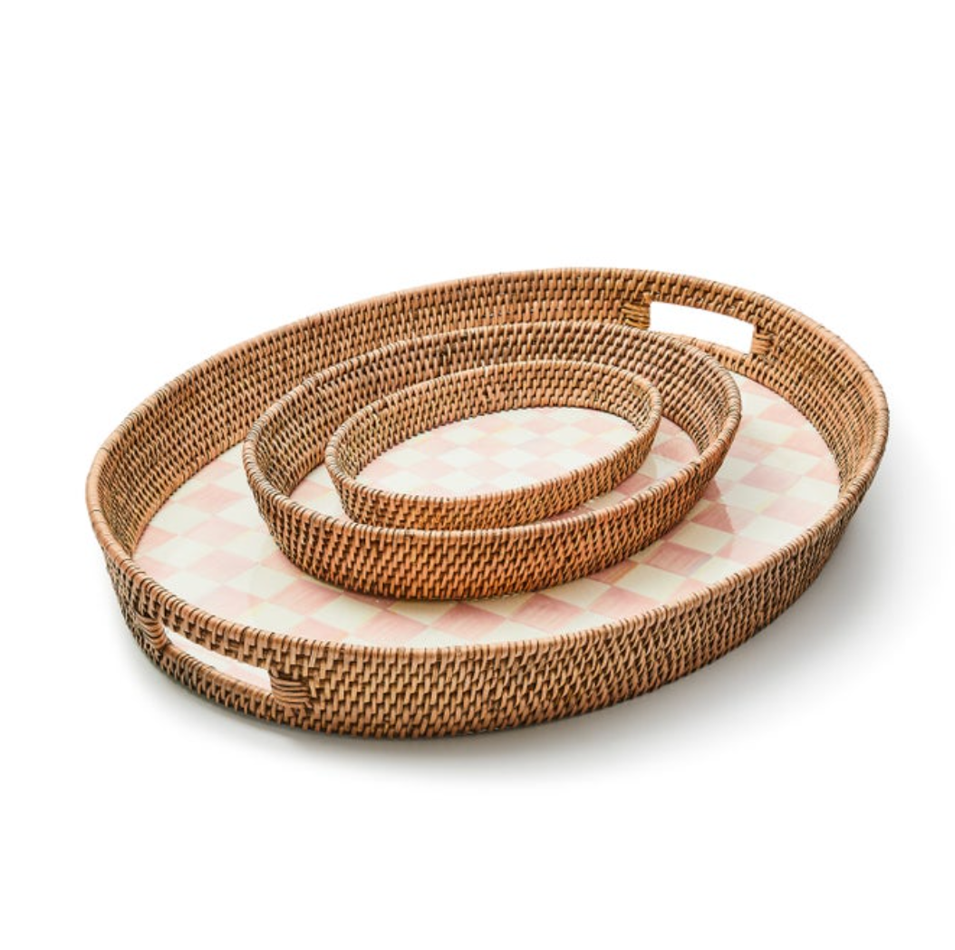 Mackenzie Childs Rosy Check Enamel & Rattan Tray