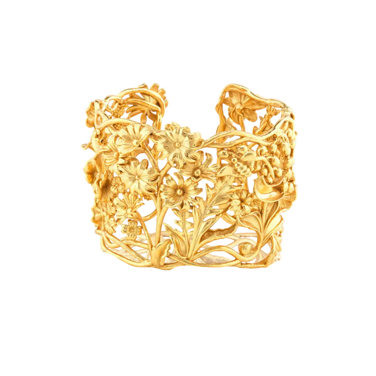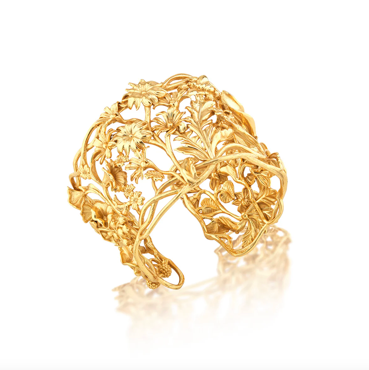 As romantic as a sonnet and as wild as a bramble, this statement cuff features golden wildflowers rendered in intricate detail. The bold and botanical beauty of this piece evokes the flower power of Mother Nature in all her untamed splendor.