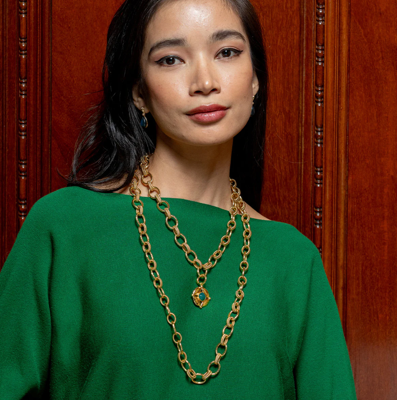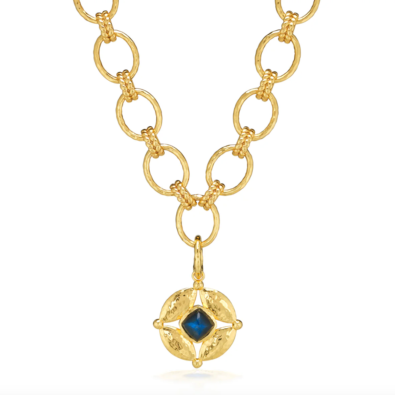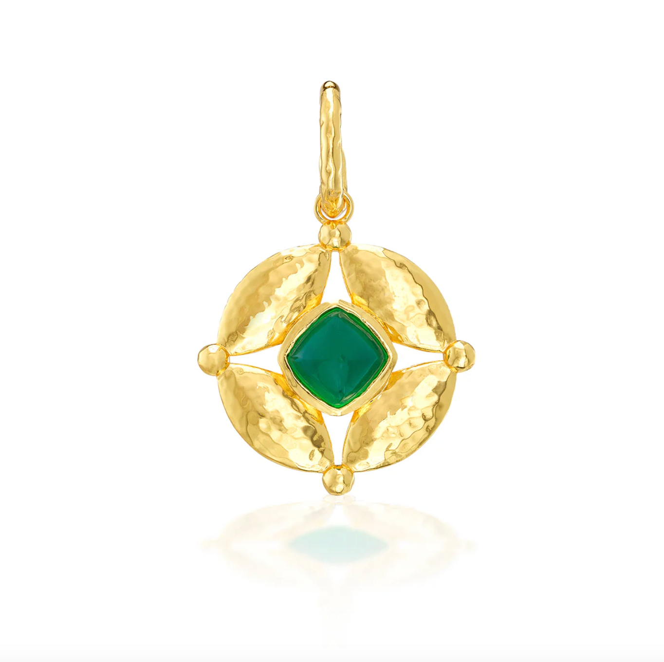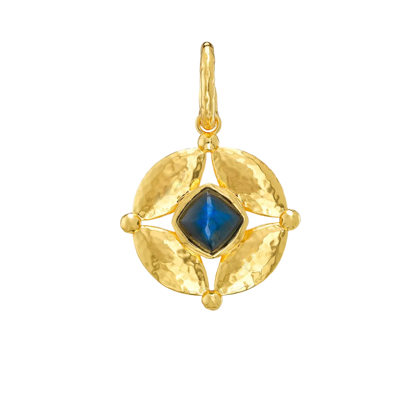 This double-sided pendant is pure eye candy to add to any chain, shimmering with hammered gold and a vibrant wink of color from lush green onyx to an intense blue labradorite gemstone. Symbolizing that cosmic place between your heart (feeling) and your head (logic), carry this Mystic Eye with you and be reminded to trust your instincts—your inner sight shines bright.