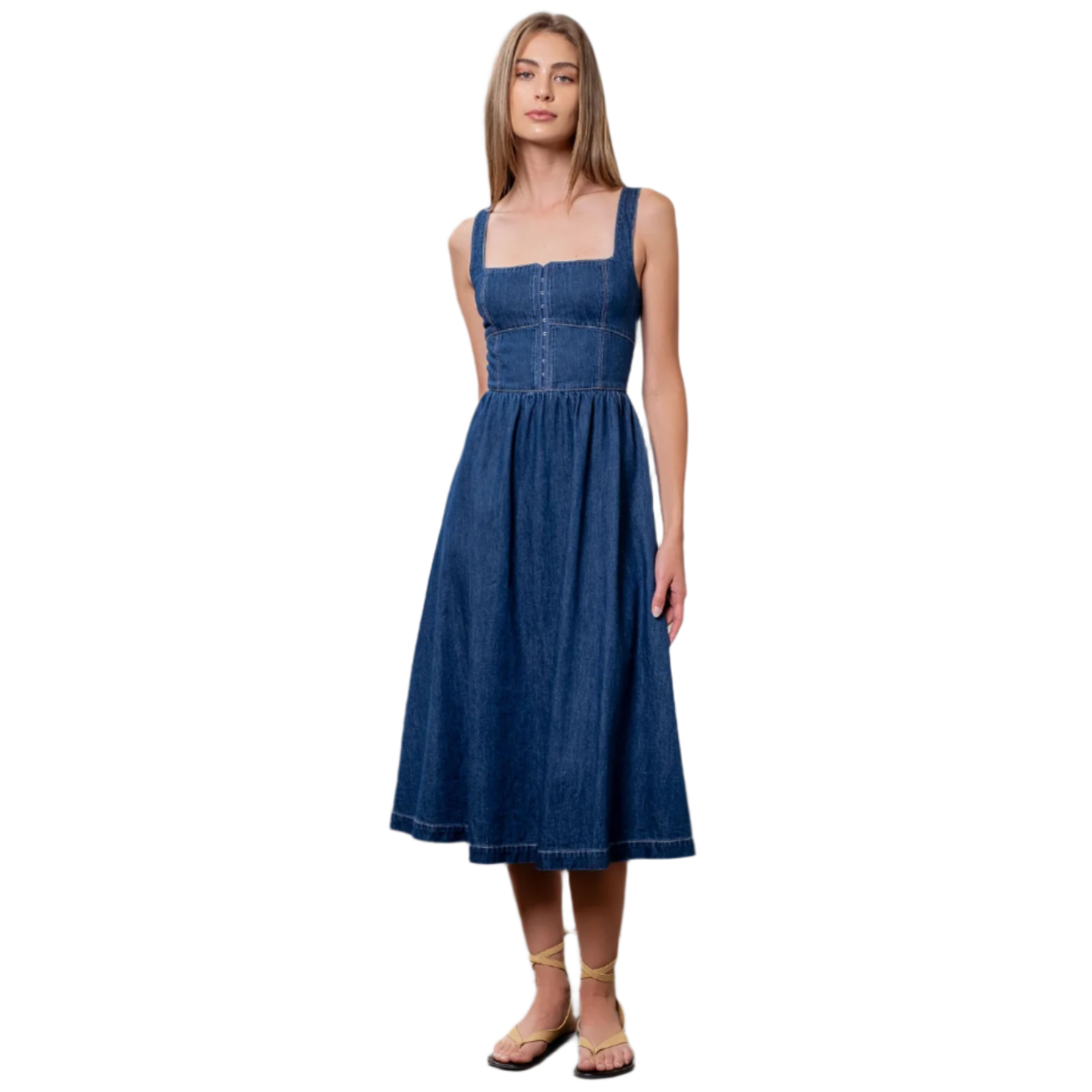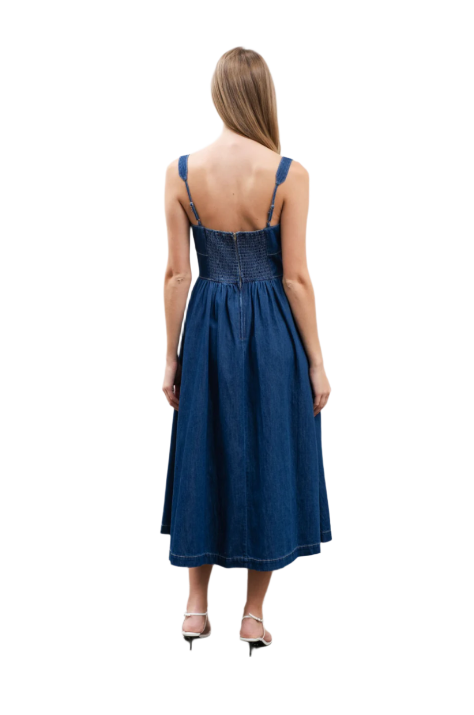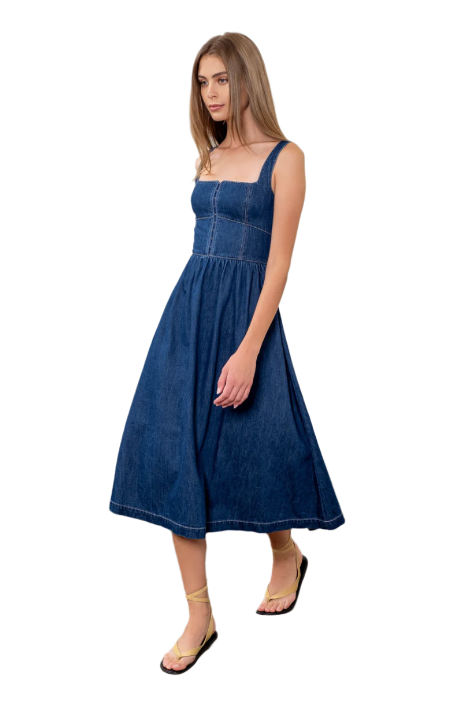 Get ready to rock in the Goldie Denim Midi Dress! With its sweetheart neck and A-line silhouette, this dress is as flattering as it is fun. The back zipper and hook closures add a touch of convenience, making it easy for you to throw on.