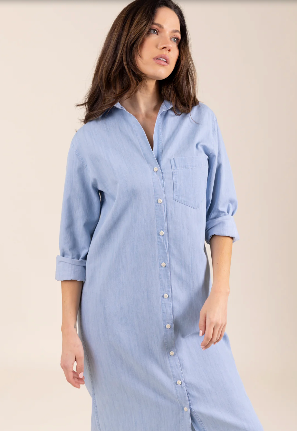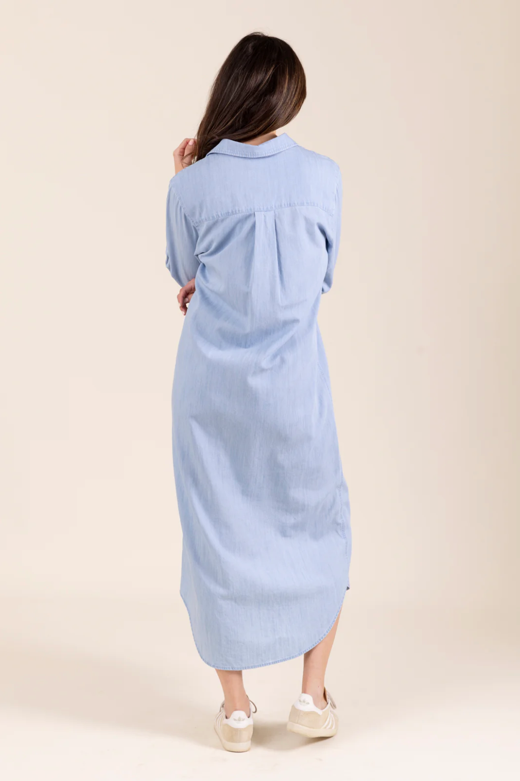 Elevate your wardrobe with the Le Marais Denim Midi Dress—a playful twist on the classic button-down shirt dress. Crafted from soft, breathable denim, it offers all-day comfort while effortlessly flattering your silhouette. Whether you're dressing it up with heels or keeping it casual with sneakers, this midi-length dress brings a chic, versatile vibe that's perfect for brunch, errands, or a spontaneous adventure. Buttons down the front add a touch of timeless charm, while the tailored fit ensures you feel confident and stylish wherever you go. Your new favorite go-to is here!