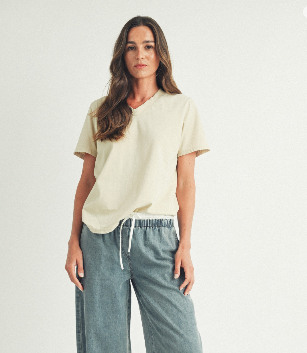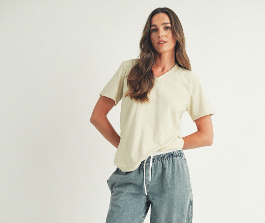 Featuring a charming V-neck that adds a flirty flair, this tee sports short sleeves and a sleek, simple shape. Crafted from a soft cotton blend, it keeps you comfy and cool all day long. Its relaxed fit makes it perfect for layering or rocking solo. A must-have staple that effortlessly jazzes up your daily wardrobe!