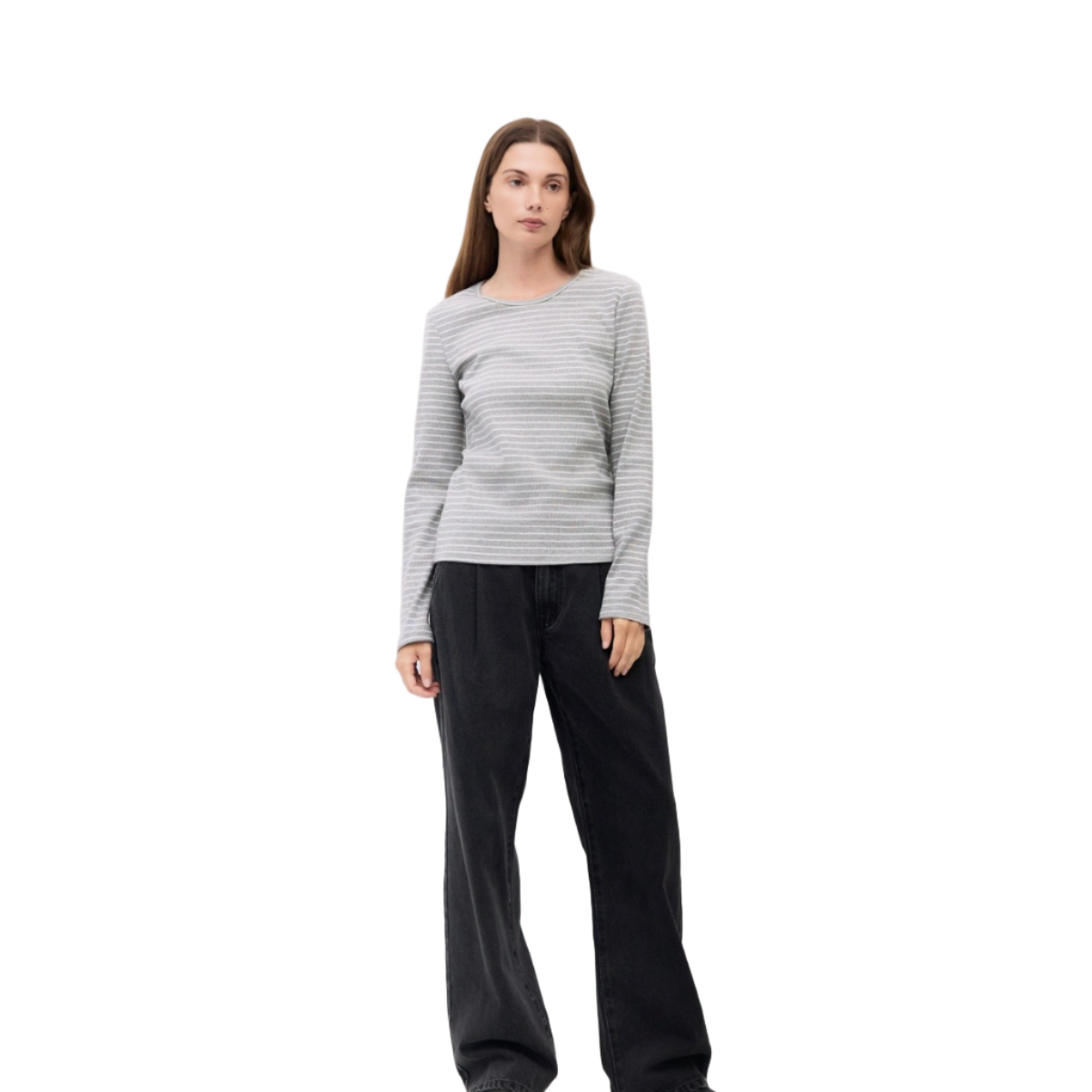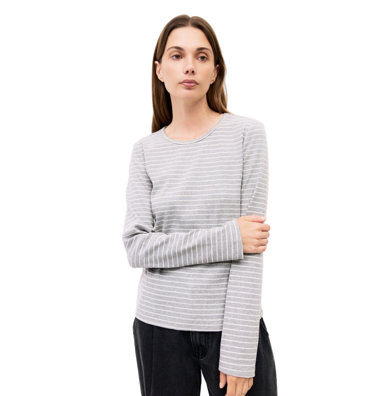 The Sadie Top is a form-fitting, long-sleeve crewneck crafted from midweight ribbed striped knit. Its streamlined silhouette and classic stripes make it a sleek layering essential.