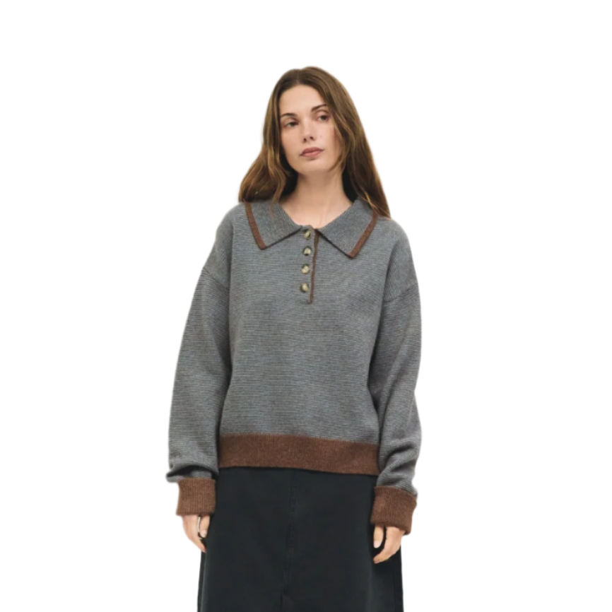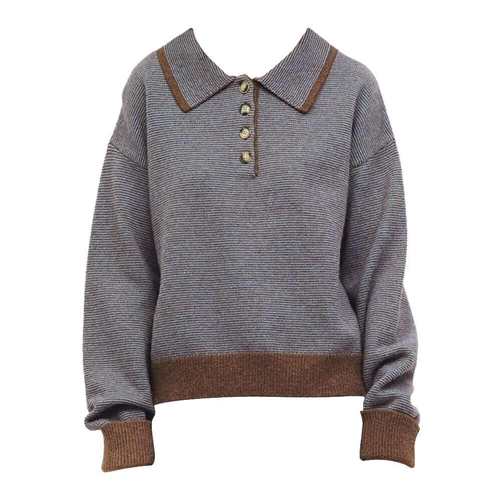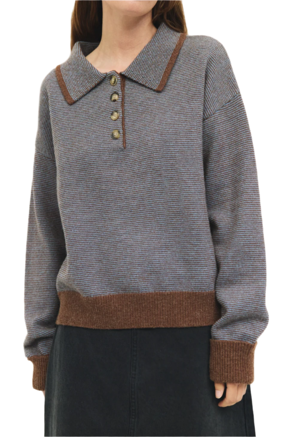 The Selma Sweater features a relaxed fit with a polo neckline and half-button placket, accented by contrast trims along the collar, cuffs, and hem. Crafted from midweight striped knit, its drop shoulders and long sleeves offer effortless, modern comfort.