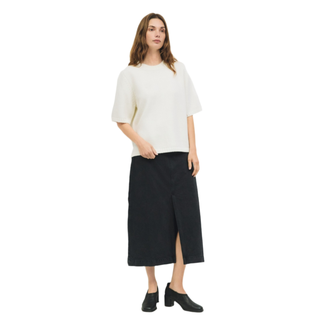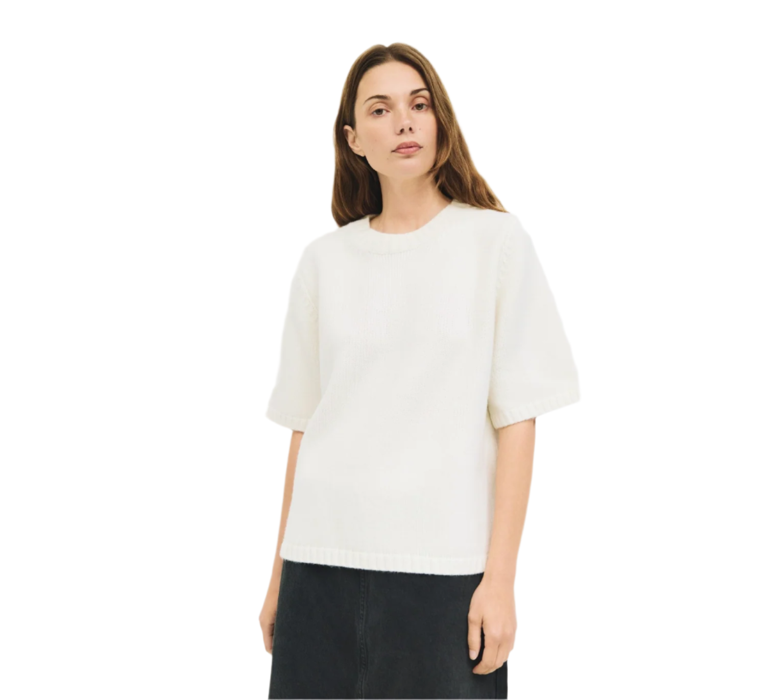 The Sorin Sweater features a boxy fit with short sleeves and a crewneck, crafted from a mid-heavy weight sweater knit for a structured yet comfortable feel. Side slit accents and ribbed trims add subtle detail to this modern essential.