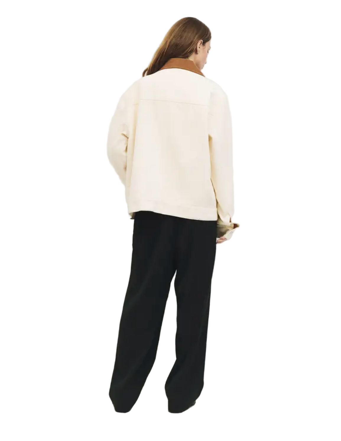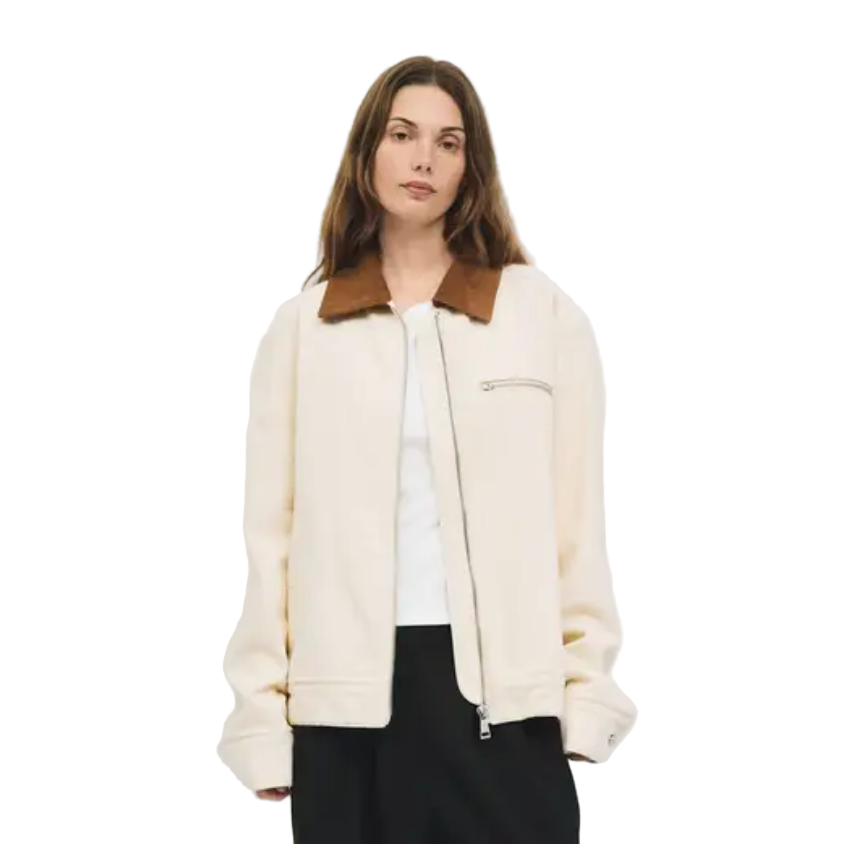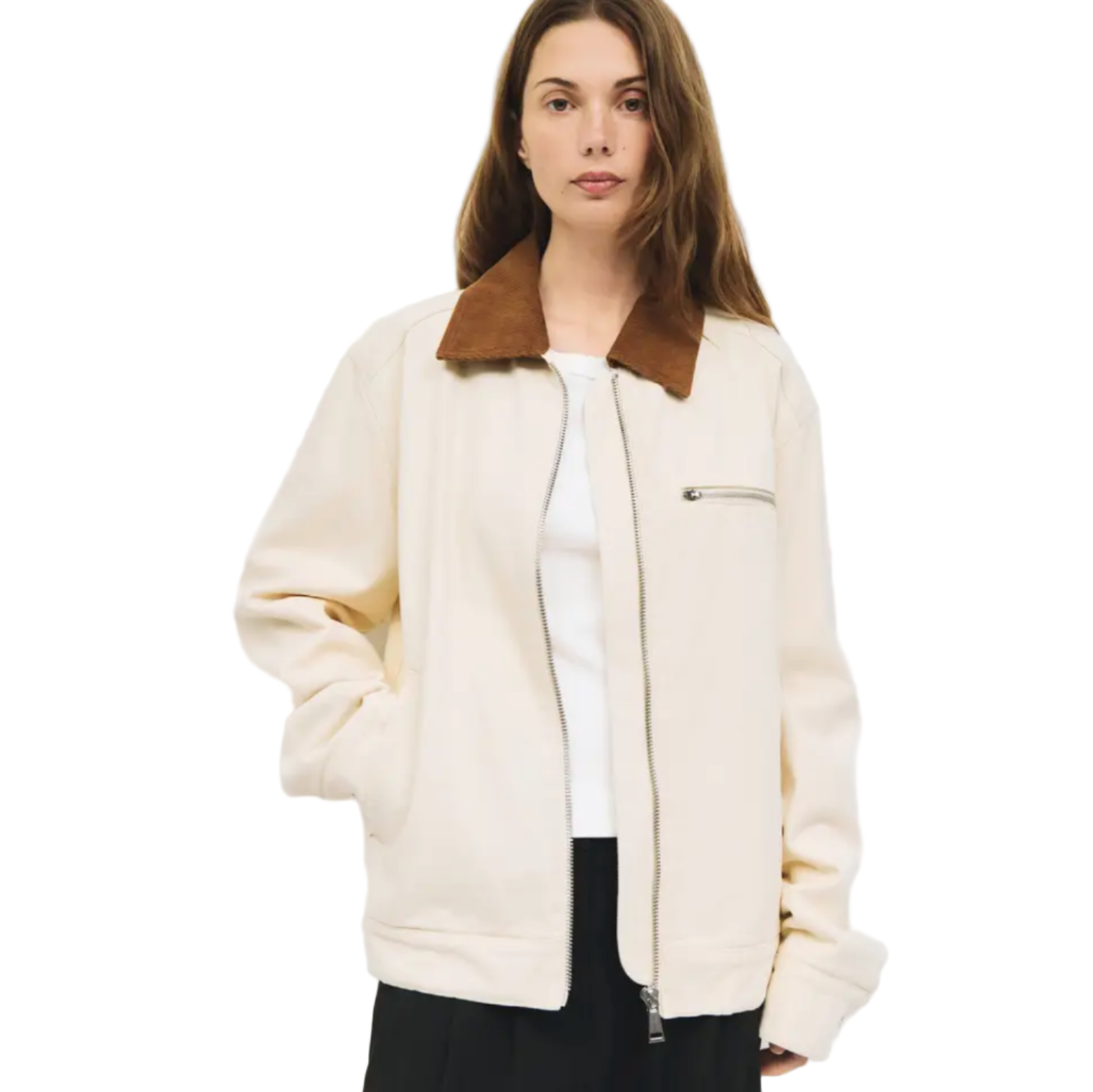The Kleid Jacket is a relaxed-fit utility jacket made from midweight twill fabric. It features a contrast corduroy collar, front zipper closure, and two front welt pockets. Fully lined for comfort, with a zippered breast pocket for added detail.