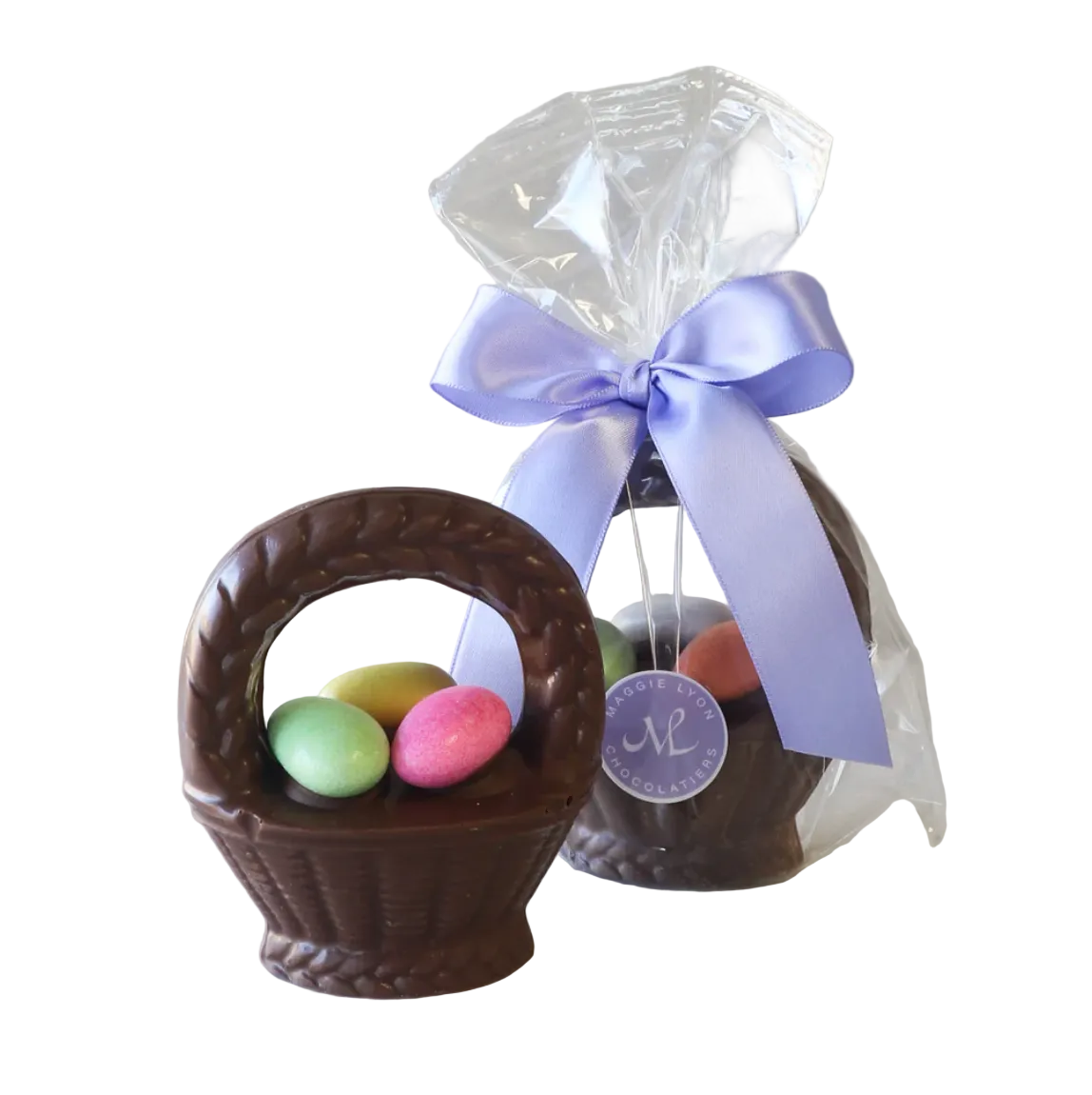 A 4.5-ounce solid milk chocolate Egg Basket with Jordan Almonds. Wrapped in a clear cellophane bag tied with Spring ribbon.