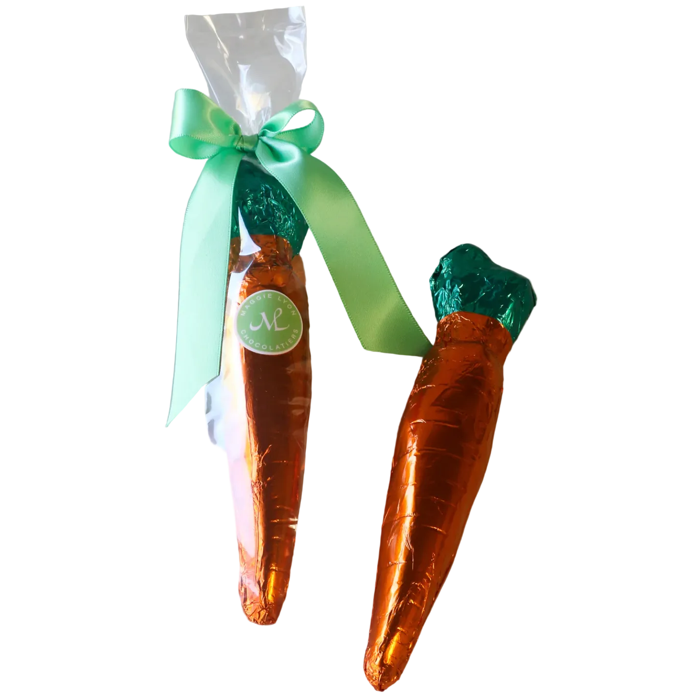 A 2.25-ounce solid milk chocolate carrot wrapped in orange & green foil. Packaged in a cellophane bag with a Spring Ribbon.