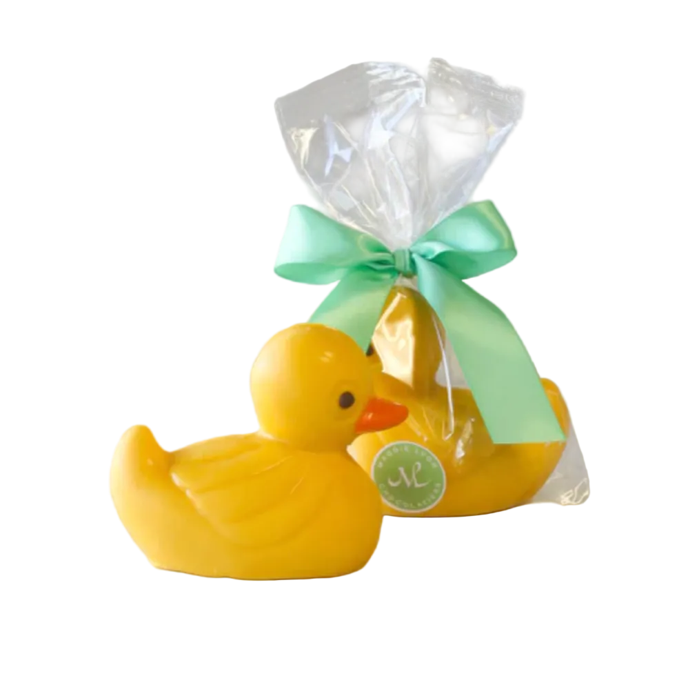 A 5-ounce solid white chocolate Rubber Ducky packaged in a clear cello bag and tied with Spring ribbon.