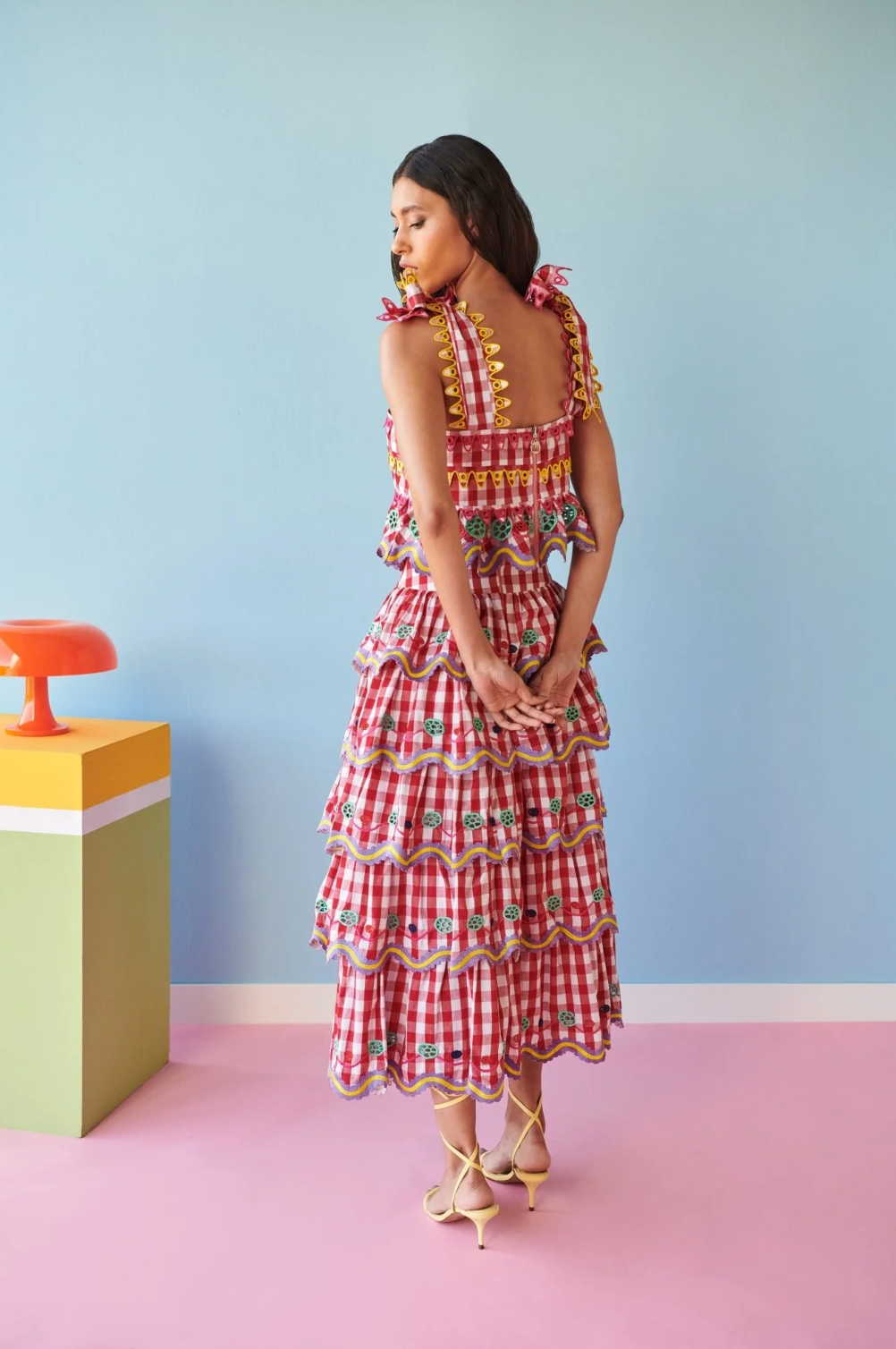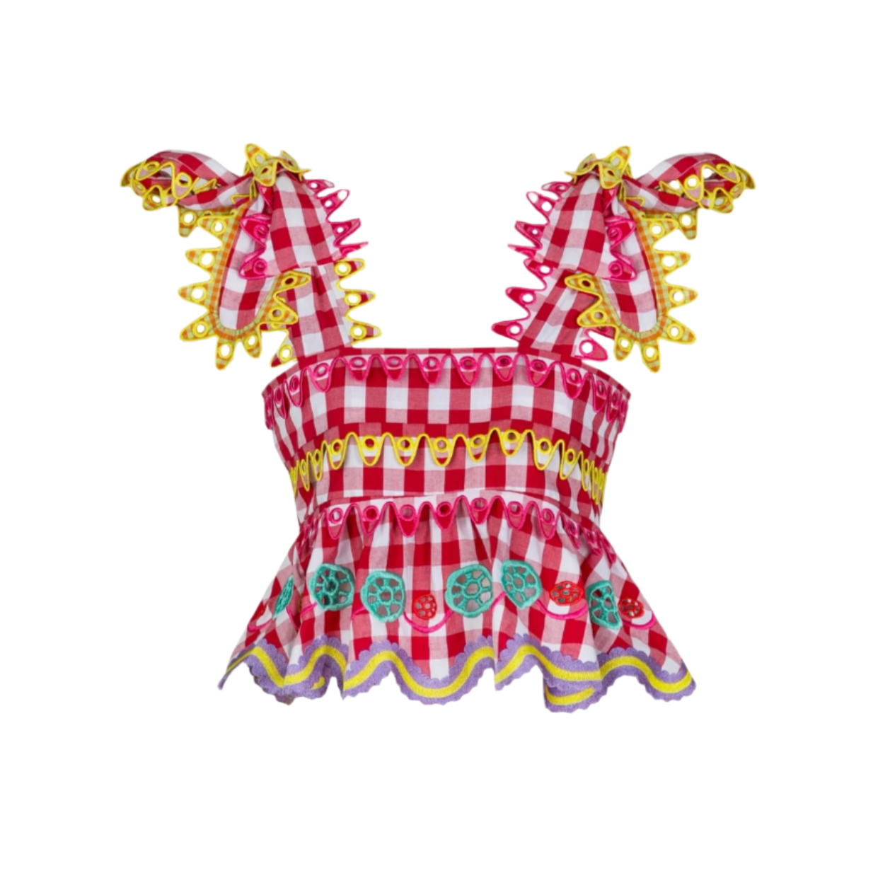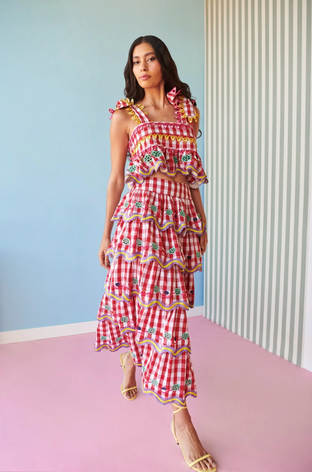 It's time for gingham! This red top is crafted with intricate cutouts and multicolored embroidered details. With tied-up straps and a back zip closure ensure the perfect fit. Pair it with the matching skirt for the full effect.