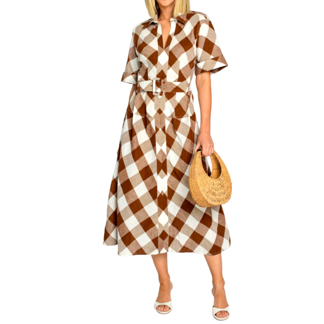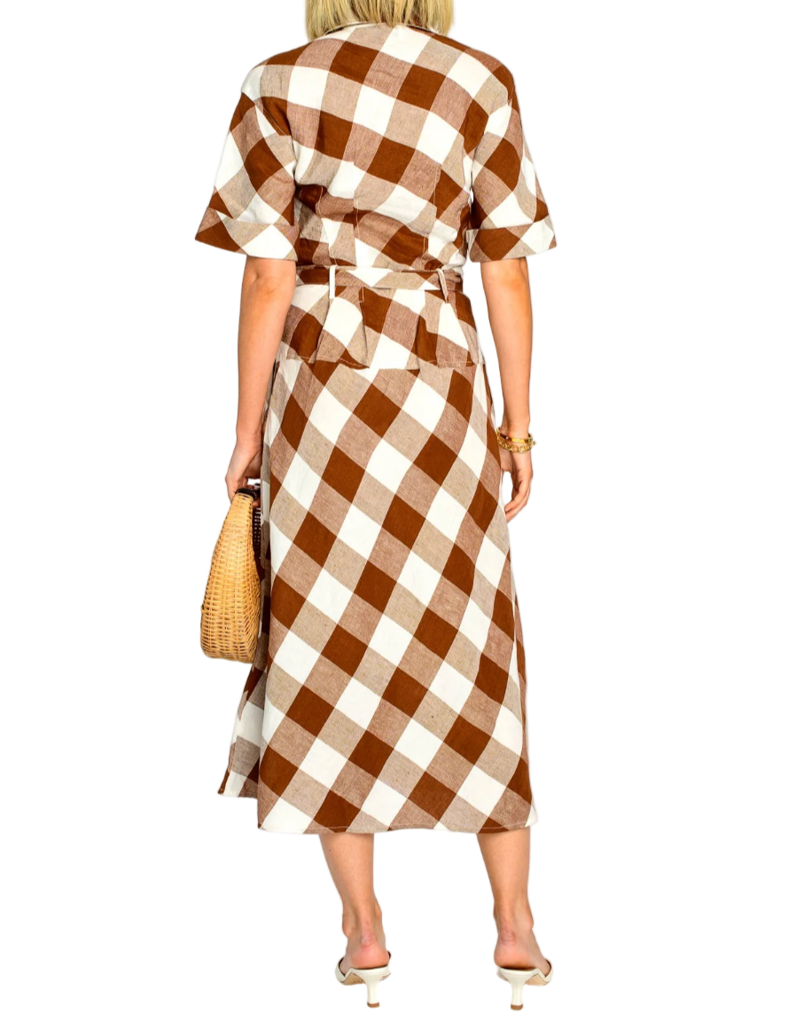The Collins Dress in Brown Gingham is a statement piece that combines sophistication with femininity. Her fitted torso is beautifully balanced by dramatic sleeves and a full skirt, polished with a matching belt buckle.
