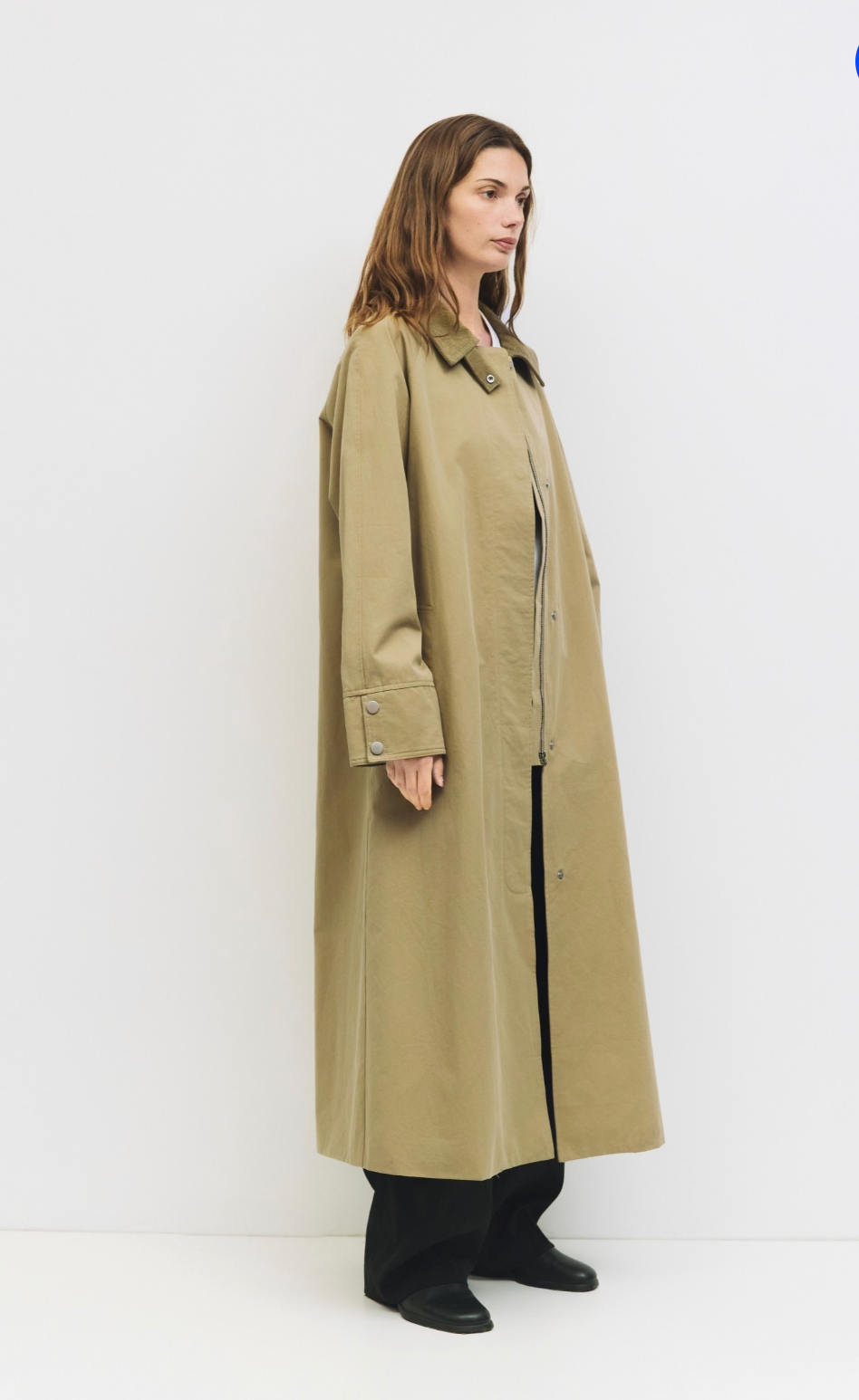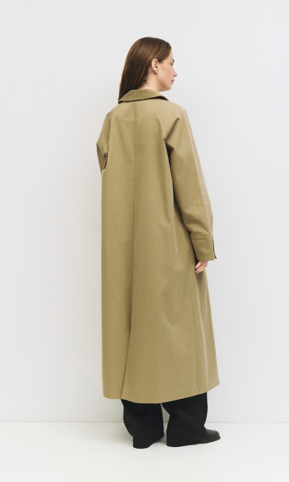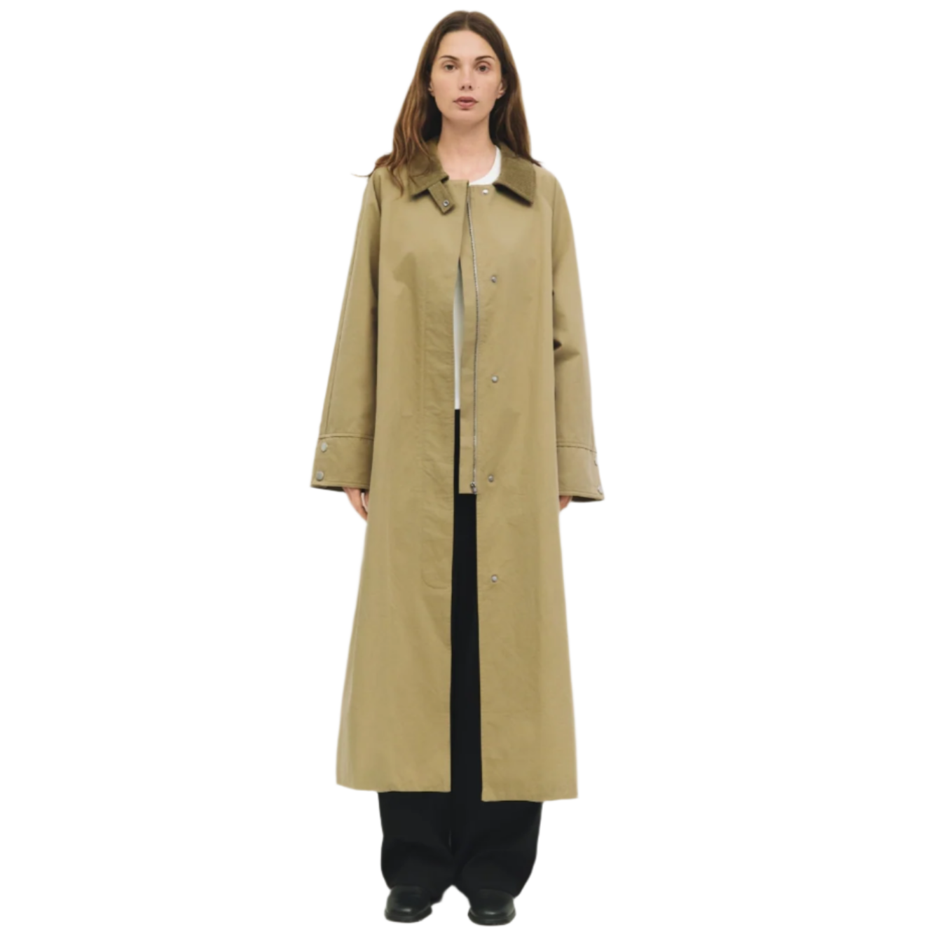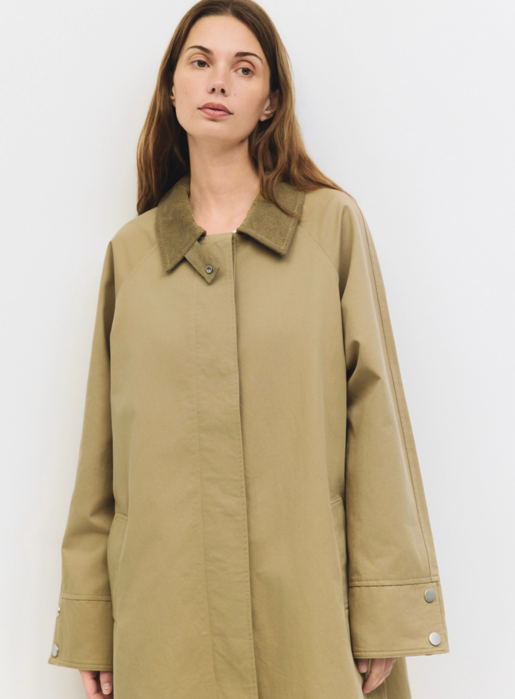 The Emilie Coat is a relaxed-fit trench in midweight twill with a contrast corduroy collar and snap-tab detail. Featuring hidden snap and zipper closures, sleeve snap cuffs, and a back slit, it blends classic tailoring with modern touches.