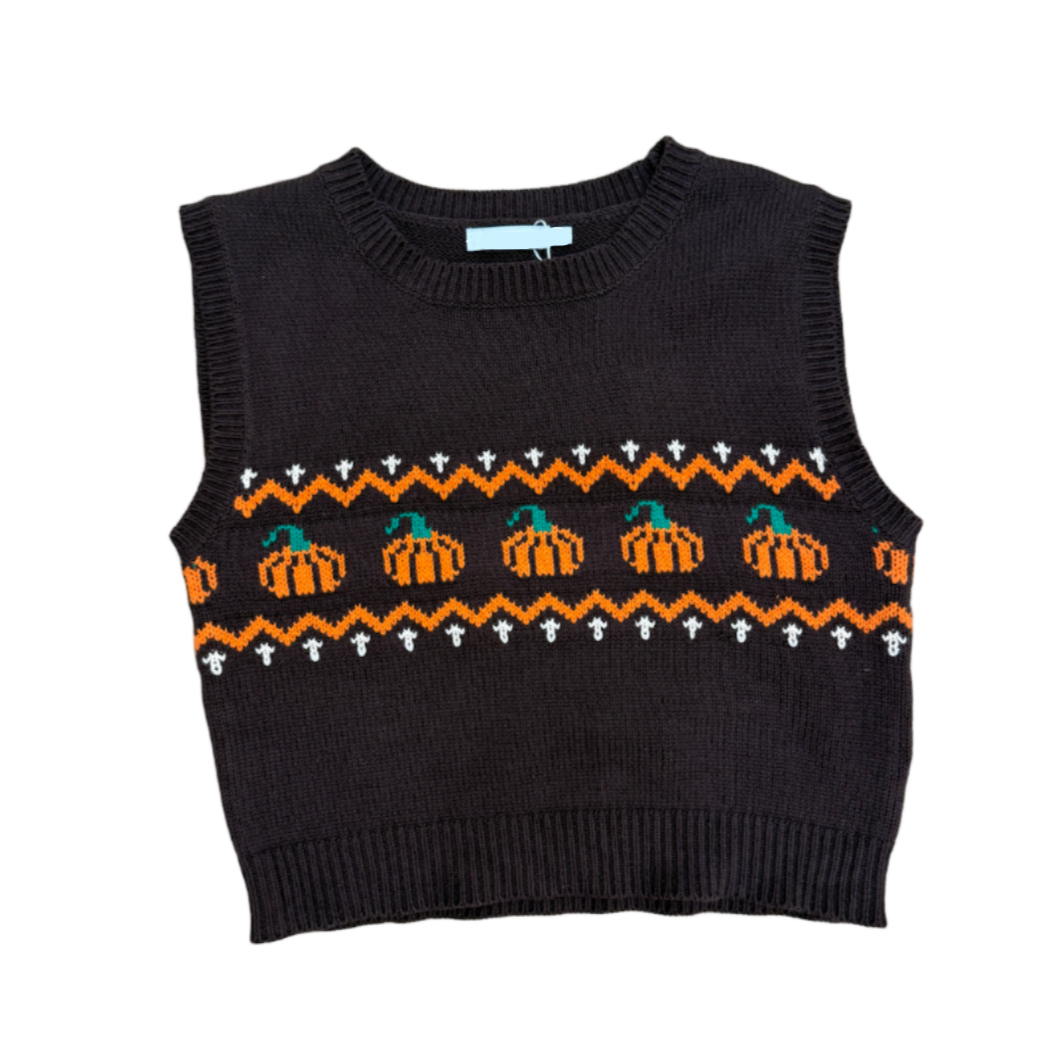 Add a cozy twist to your fall style with this vintage chocolate brown pumpkin sweater vest. Its warm, rich hue and charming pumpkin design bring a playful autumn vibe to any outfit. Perfect for layering over your favorite shirt or dress, this vest adds a touch of nostalgic charm and festive fun to your wardrobe.