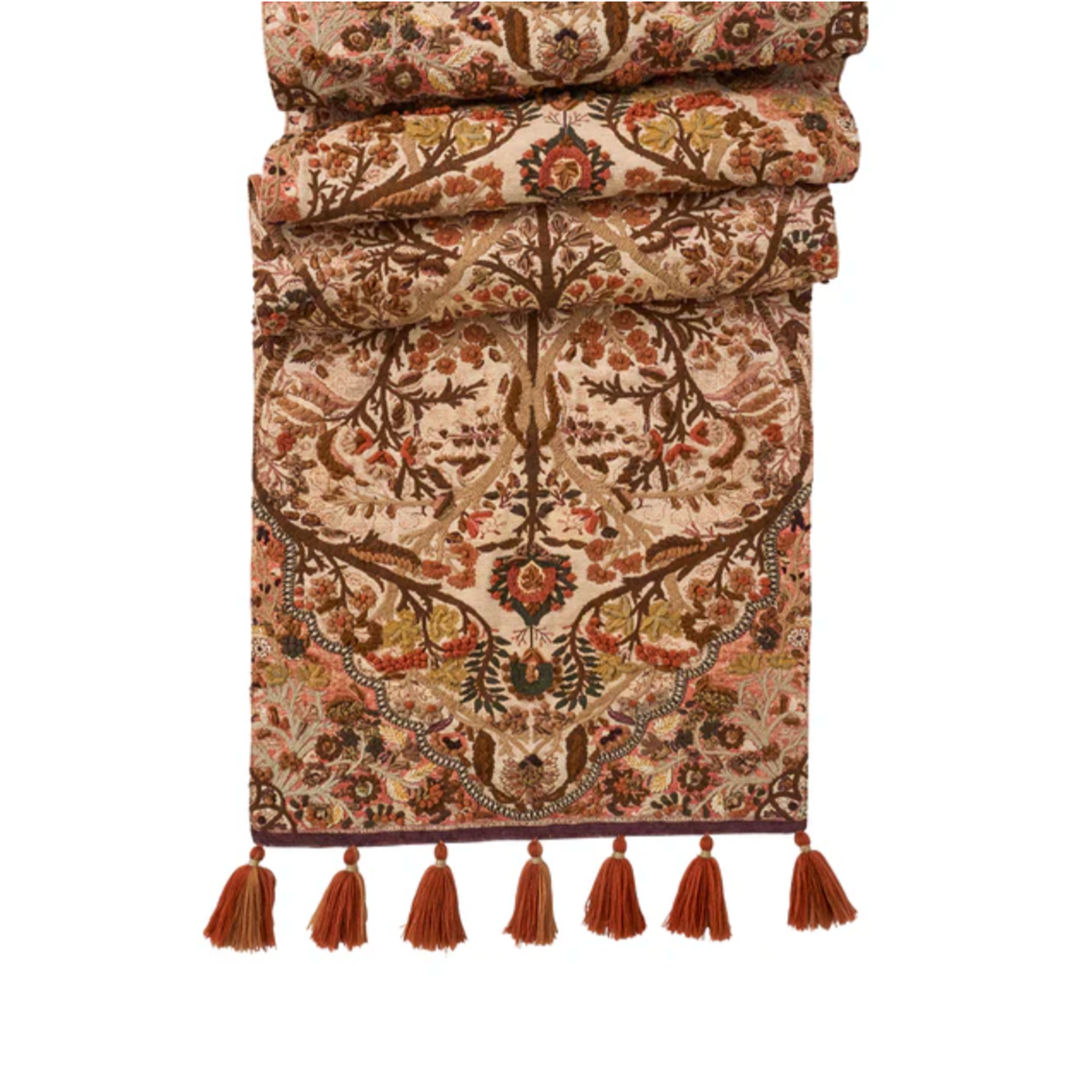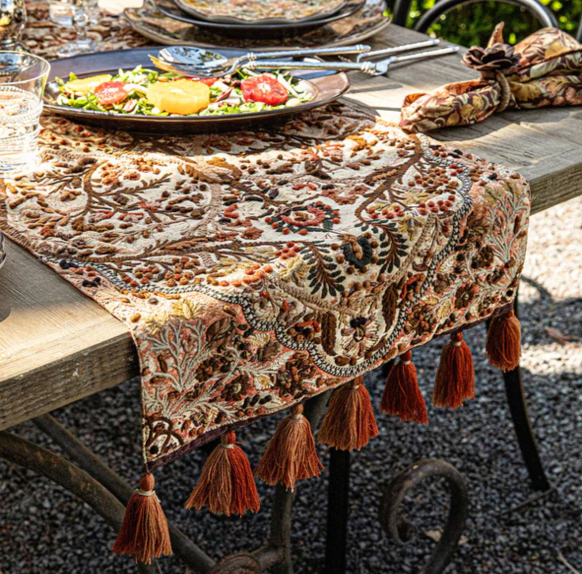 Bring a gorgeous texture to your table with this sumptuous runner that was inspired by heirloom tapestries. Featuring intricate embroidery throughout, tassels on either end, and a golden palette that evokes the richness of the earth, this runner is stunning dressed up or down, all season long.