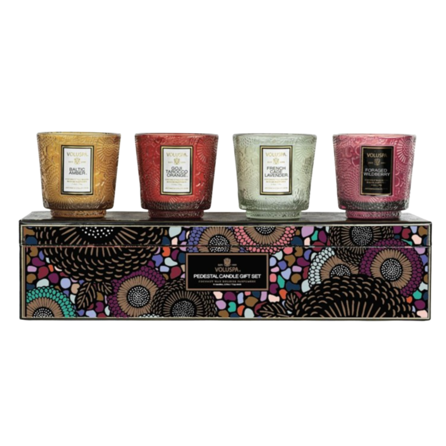 This beloved set of best sellers contains four 2.5 oz. candles in scents Baltic Amber, Goji Tarocco Orange, French Cade Lavender, and Foraged Wildberry (one of each).