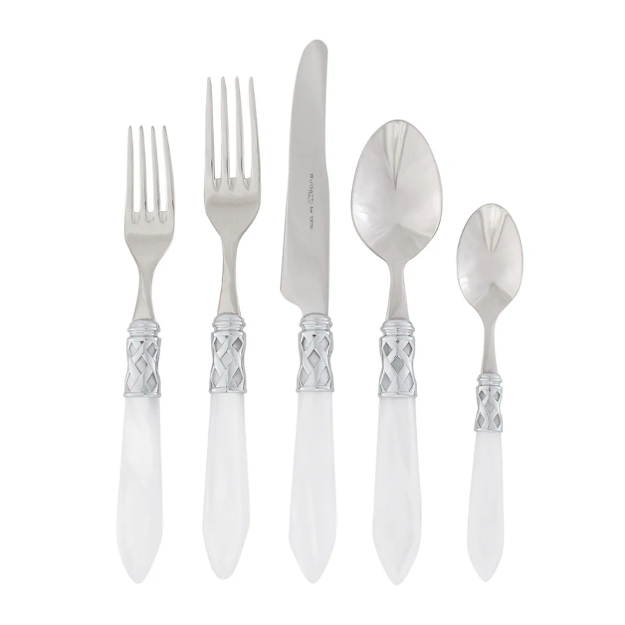 The Aladdin Brilliant Salad Fork features elegant pearlized handles with the strength of high-grade acrylic and 18/10 stainless steel. This piece is also available in our antique finish.