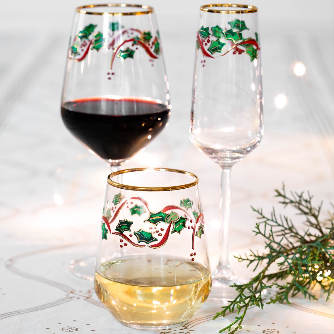 Charm your guests with the season’s favorite motif: Holly, a festive drinkware assortment that easily adds to holiday cookie exchanges or white elephant get-togethers.