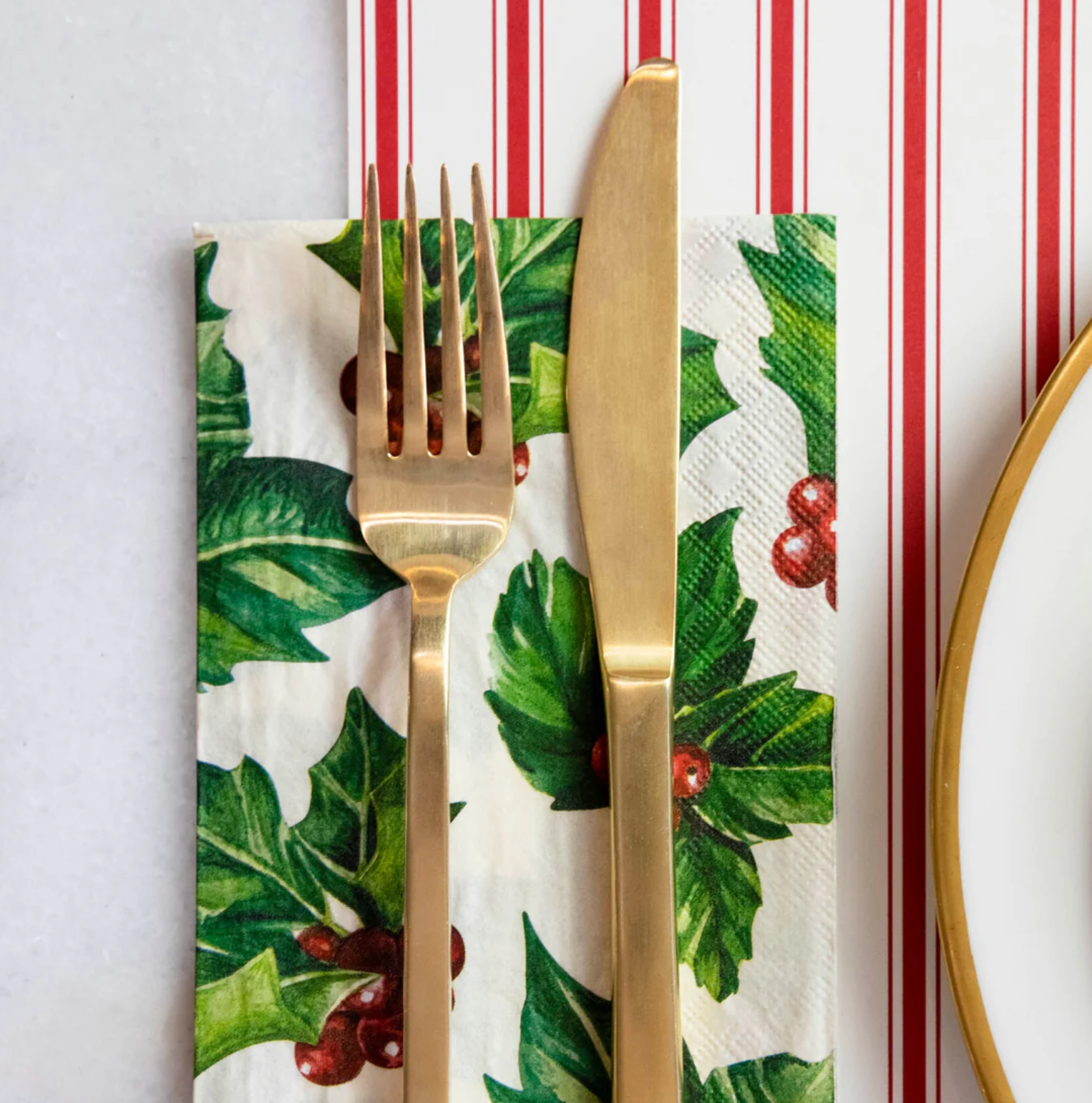 A cheerful addition to our holiday lineup! Pair these Holly Napkins with our Die-Cut Santa Placemat and our Candy Stripe Placemat for a fresh interpretation of a traditional look.