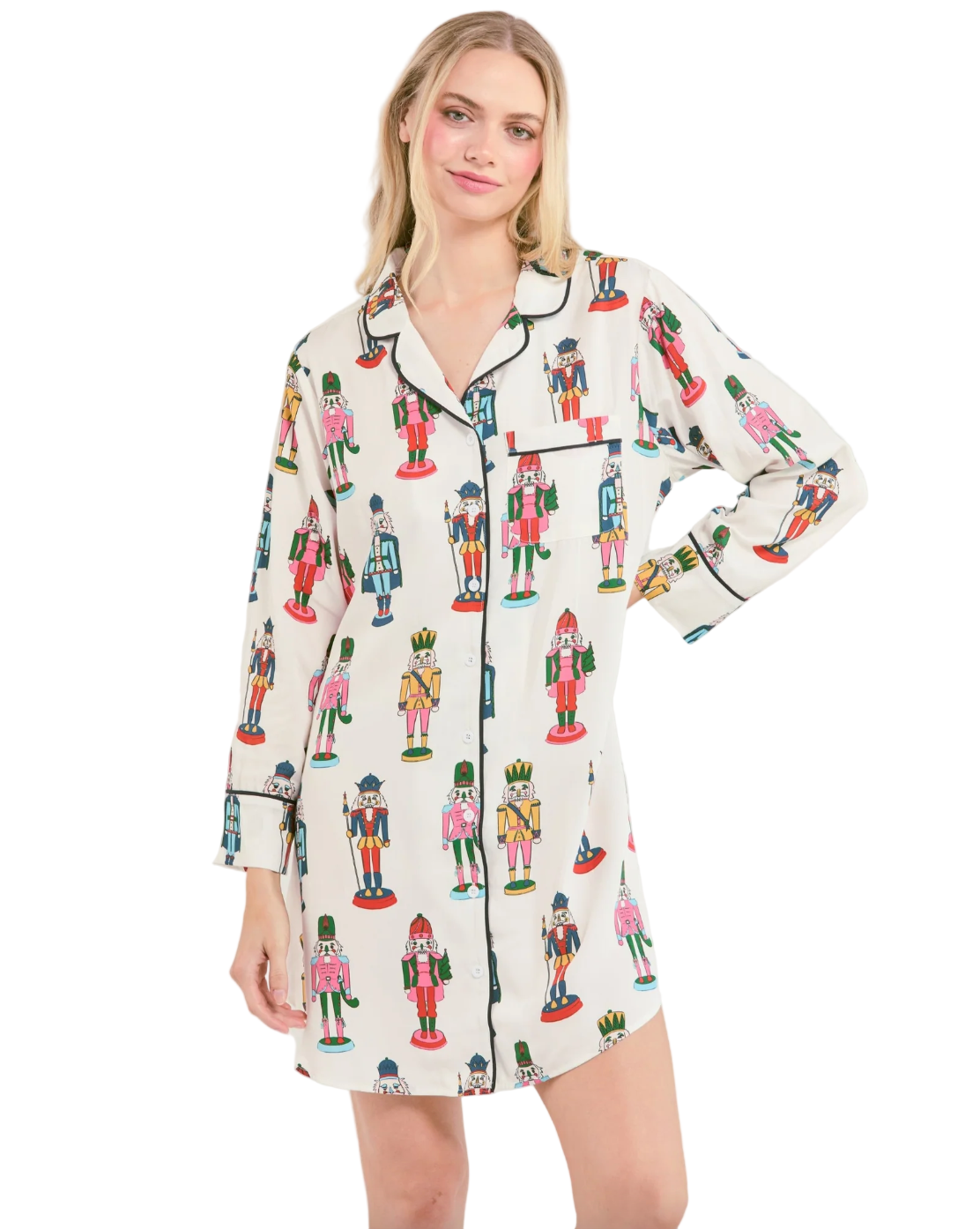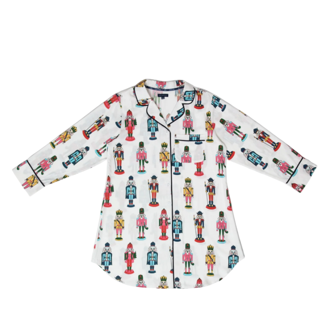 The Katie Kime Holiday March print is a candy-colored tribute to the world’s greatest Christmas ballet and many memories from our own holidays past. Say hello to your new sleepwear staple. Our women’s sleep shirt is crafted from a luxurious 50% cotton and 50% modal blend for a breathable, buttery-soft feel. Inspired by the classic men’s button-down but reimagined for her, this nightshirt features a relaxed fit, contrast piping, and just the right amount of polish. Finished in our iconic Katie Kime prints, it’s the kind of sleepwear that doubles as loungewear—and even gets packed for girls’ weekends.
