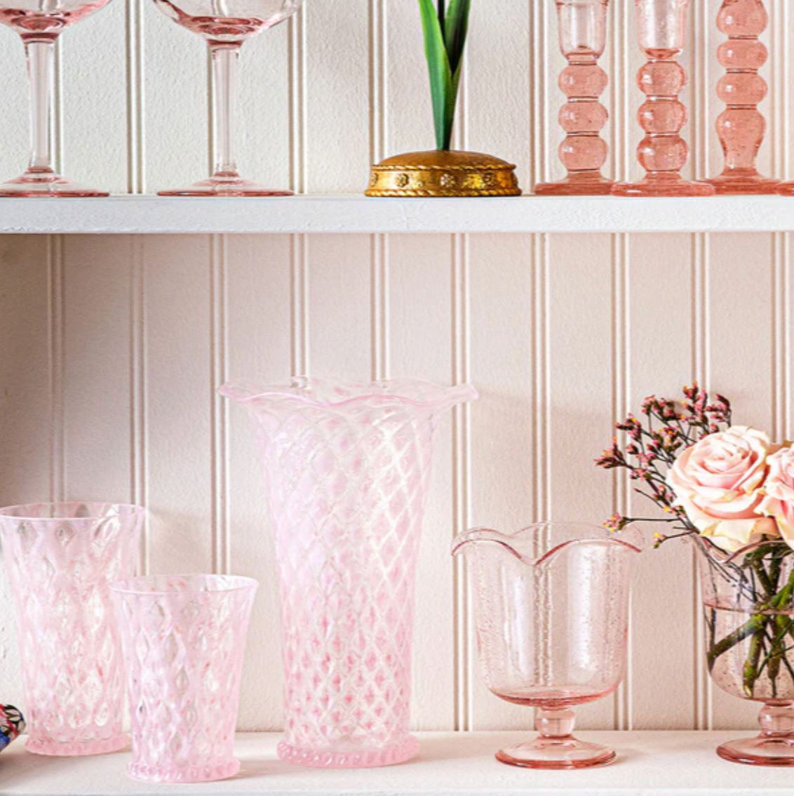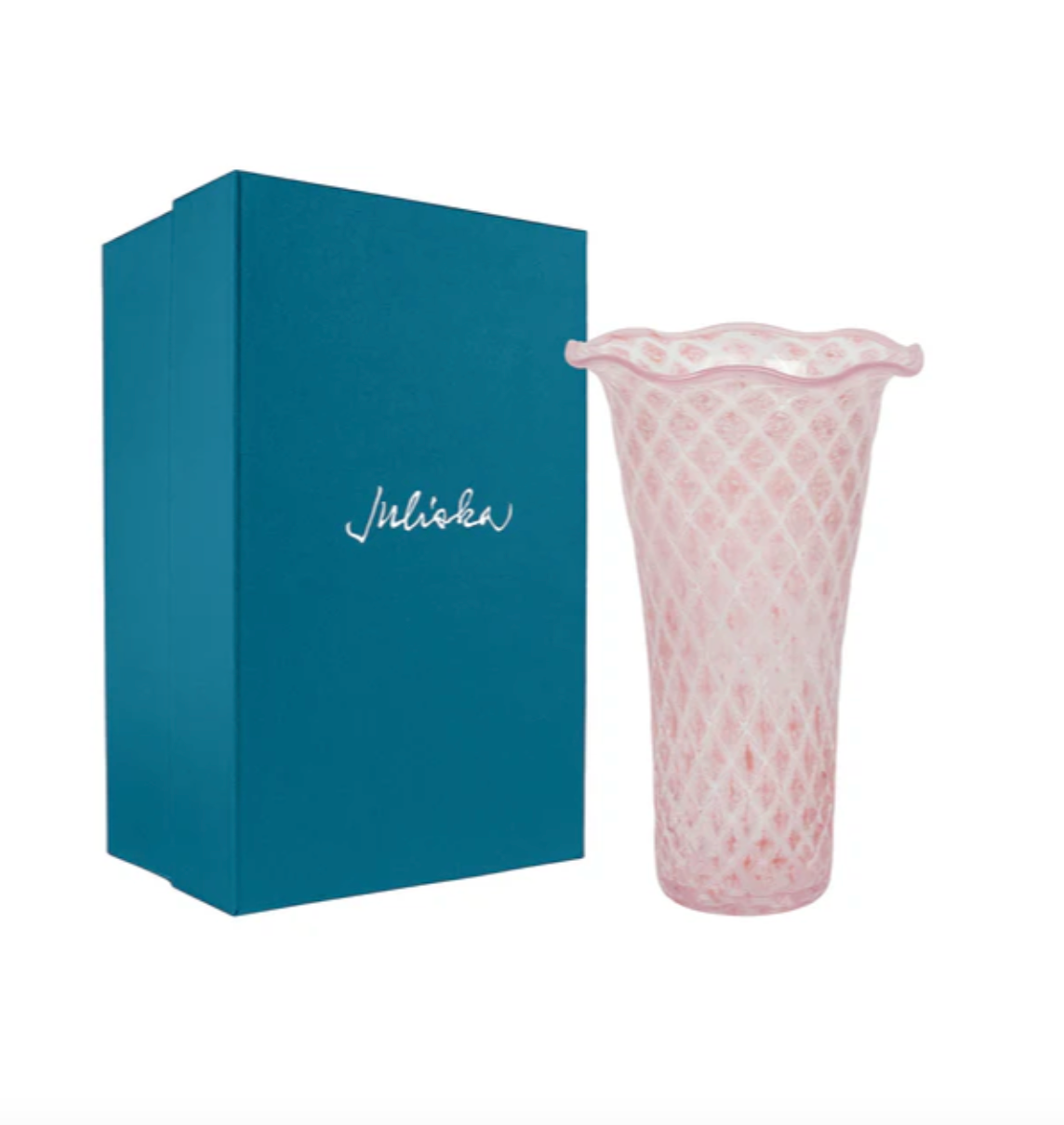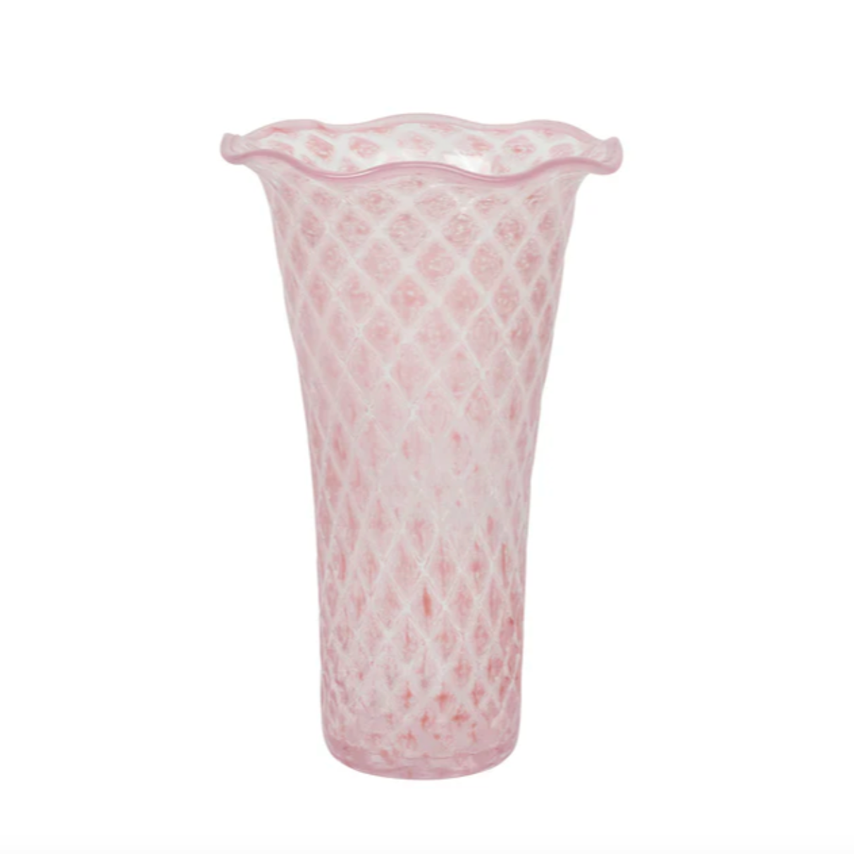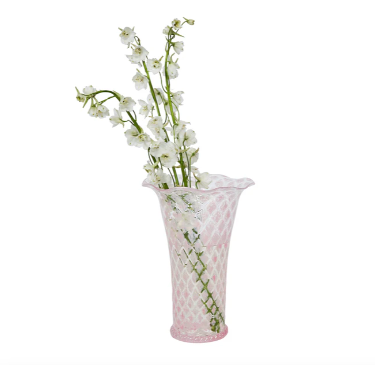 This undeniably romantic vase has a flared, feminine silhouette with a ruffled rim and our intricate, trellis motif in a blushing pink hue that sets off everything from formal floral arrangements to armfuls of garden flowers to utter perfection.