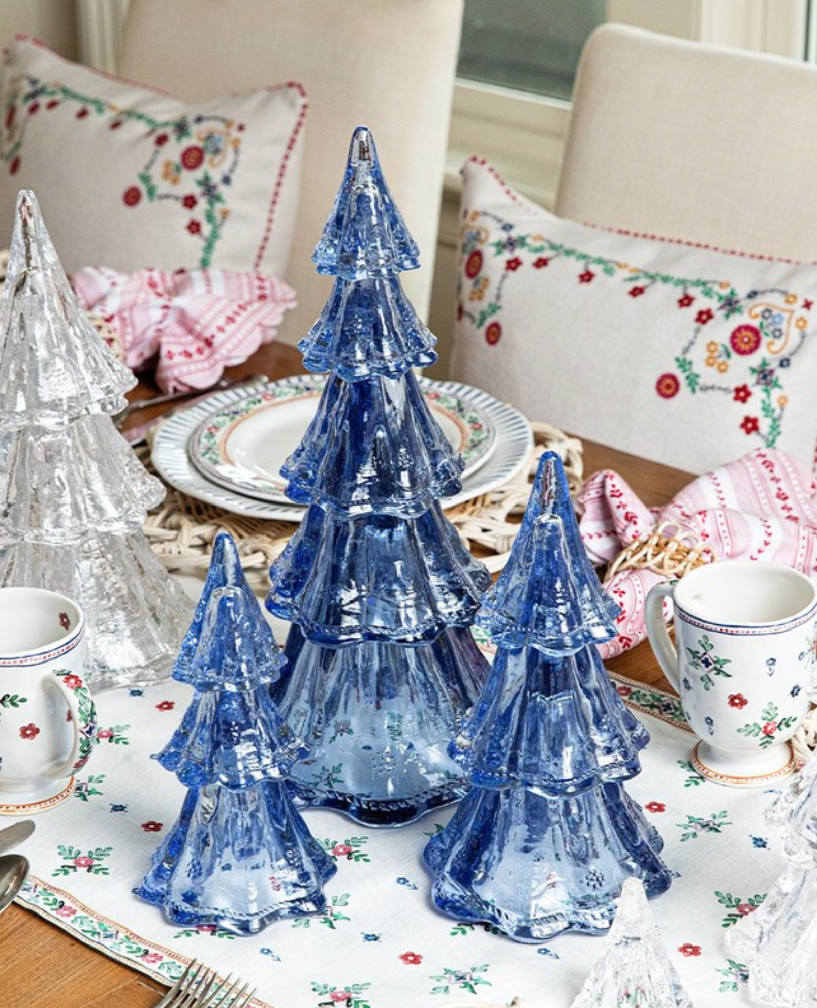 Perfect for embellishing holiday tables or mantles, these striking glass trees have been adorned with iconic Berry & Thread decoration. This set of three pieces includes the mini, small and medium tree tiers, which may be used individually or as a stacked set.