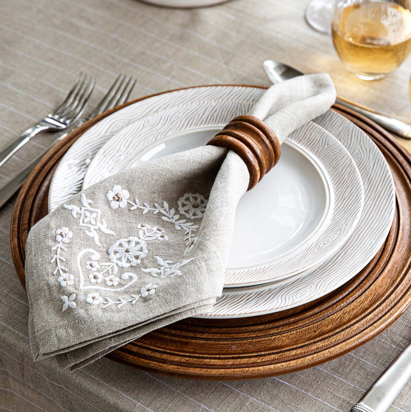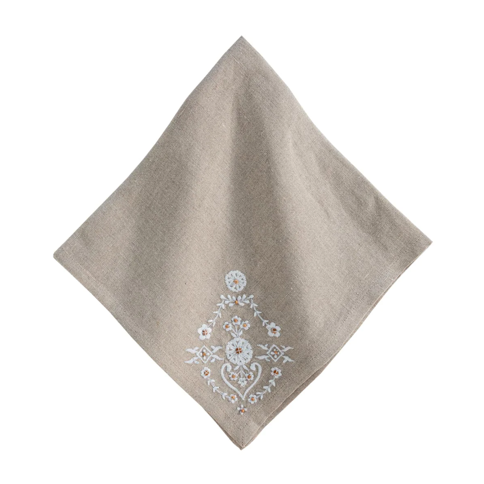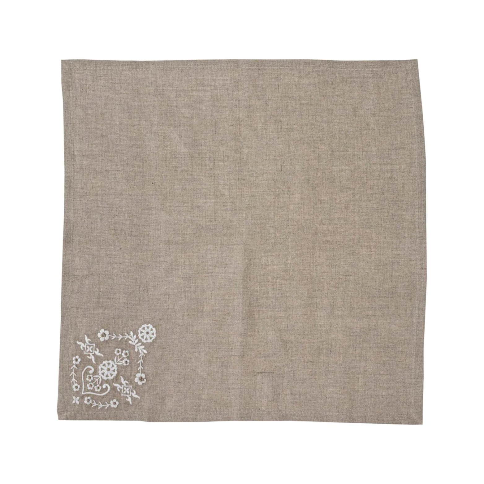 Evocative of inherited heirlooms, these linen napkins of woven cotton feature subtly stunning embroidery at the corner (perfect placement for styling within napkin rings) in an intricate floral motif that adds instant easy elegance to any table. The neutral flax canvas with cream details works beautifully year-round, from holiday tablescapes to weekend suppers.