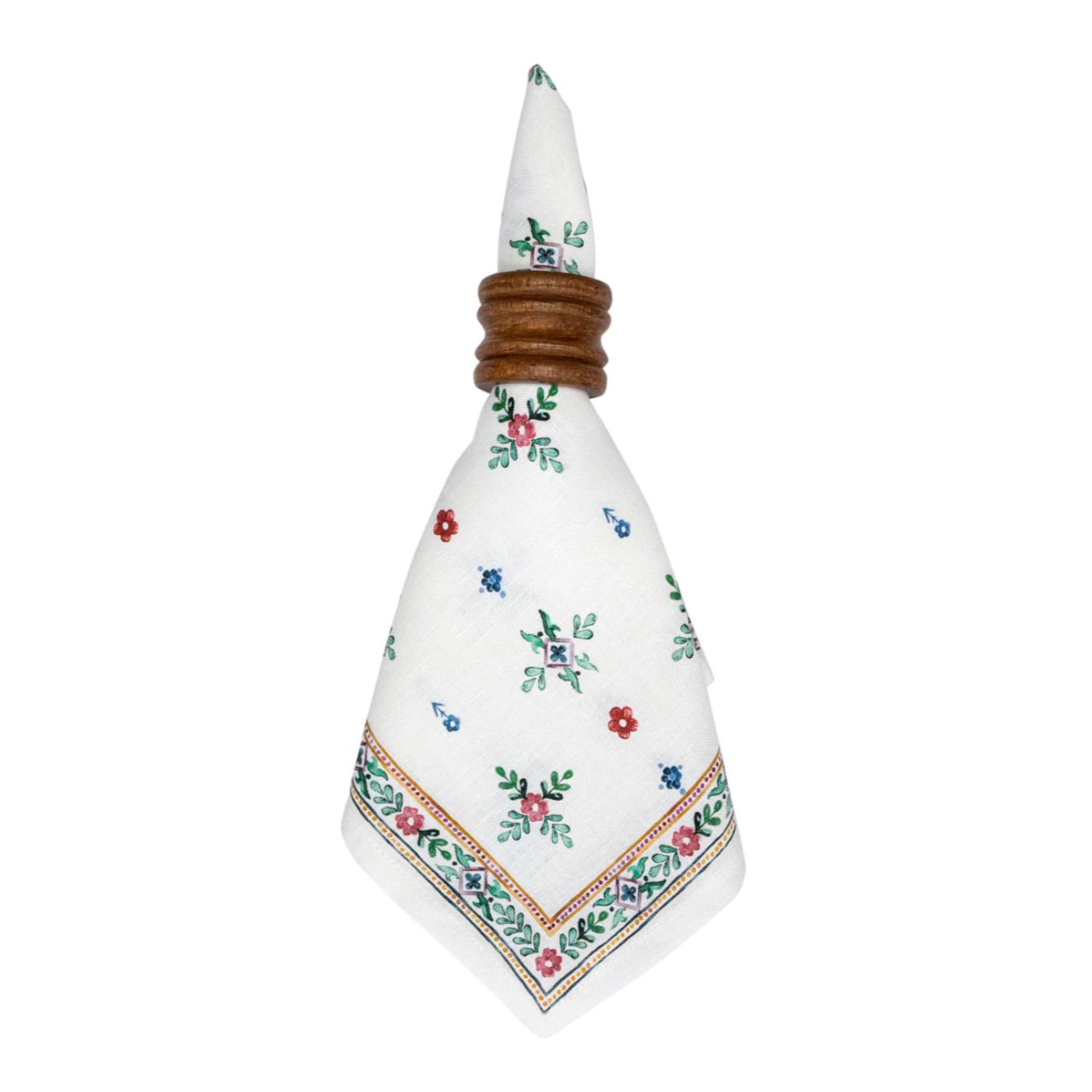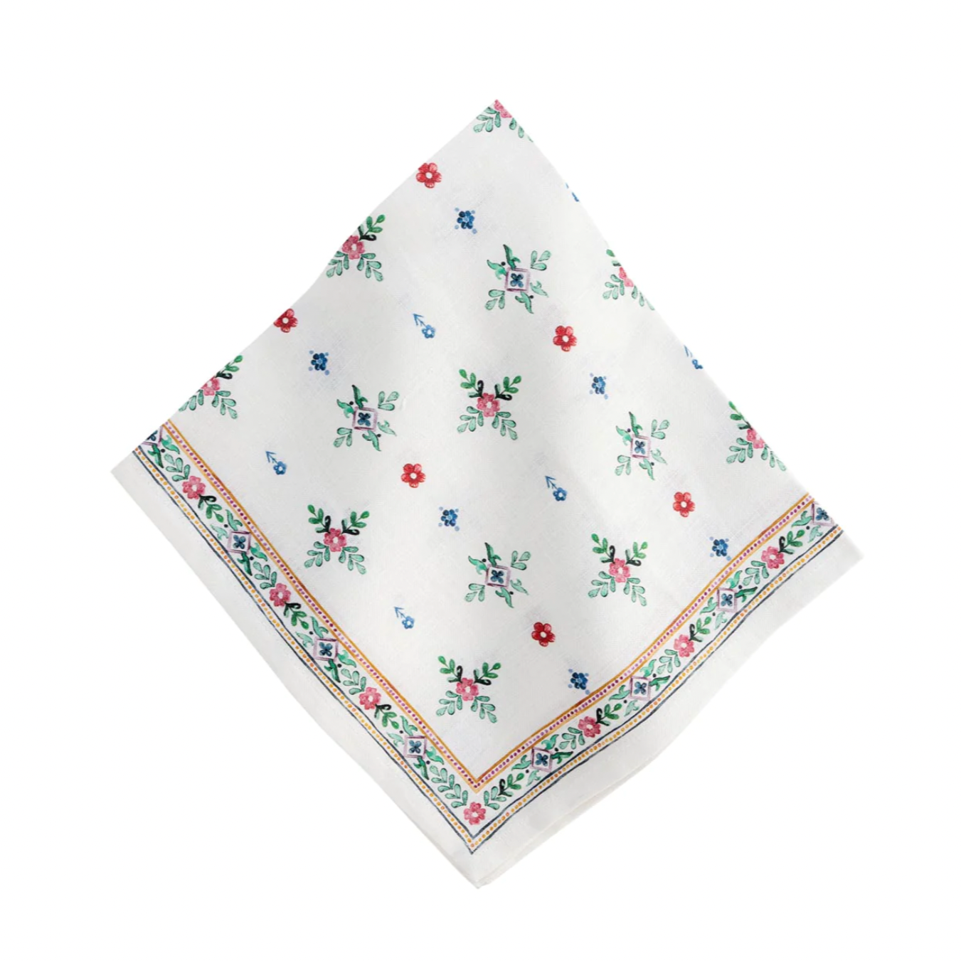 A folkloric wildflower motif from the Austrian alps in a playful pastoral pattern of edelweiss and bellflowers is done in joyful colors on a snowy white background. Vibrant and versatile, this linen napkin is designed to delight year-round, from summer’s al fresco entertaining to winter’s holiday gatherings.