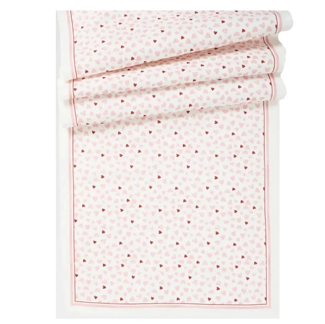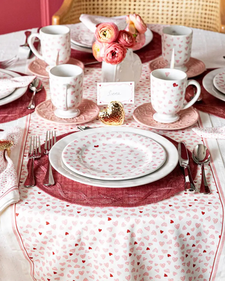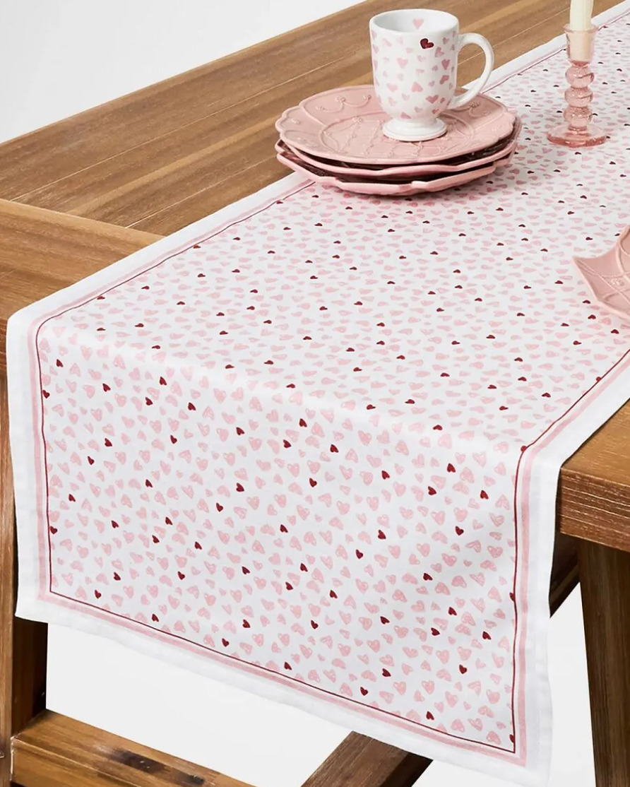 Pretty in pink, sprinkled with hearts, and trimmed with prim pinstripes, this table runner unfurls a cheerful and romantic feel to kitchen and dining tables, however casually or formally you style it.
