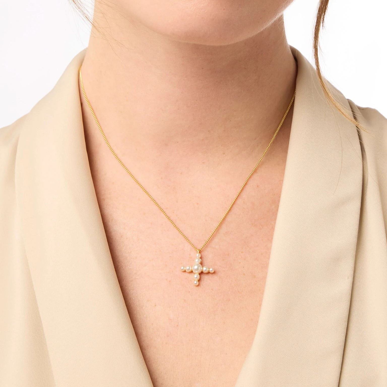 Gemstone beads arranged in a cross shape, dangling from a delicate curb chain.
