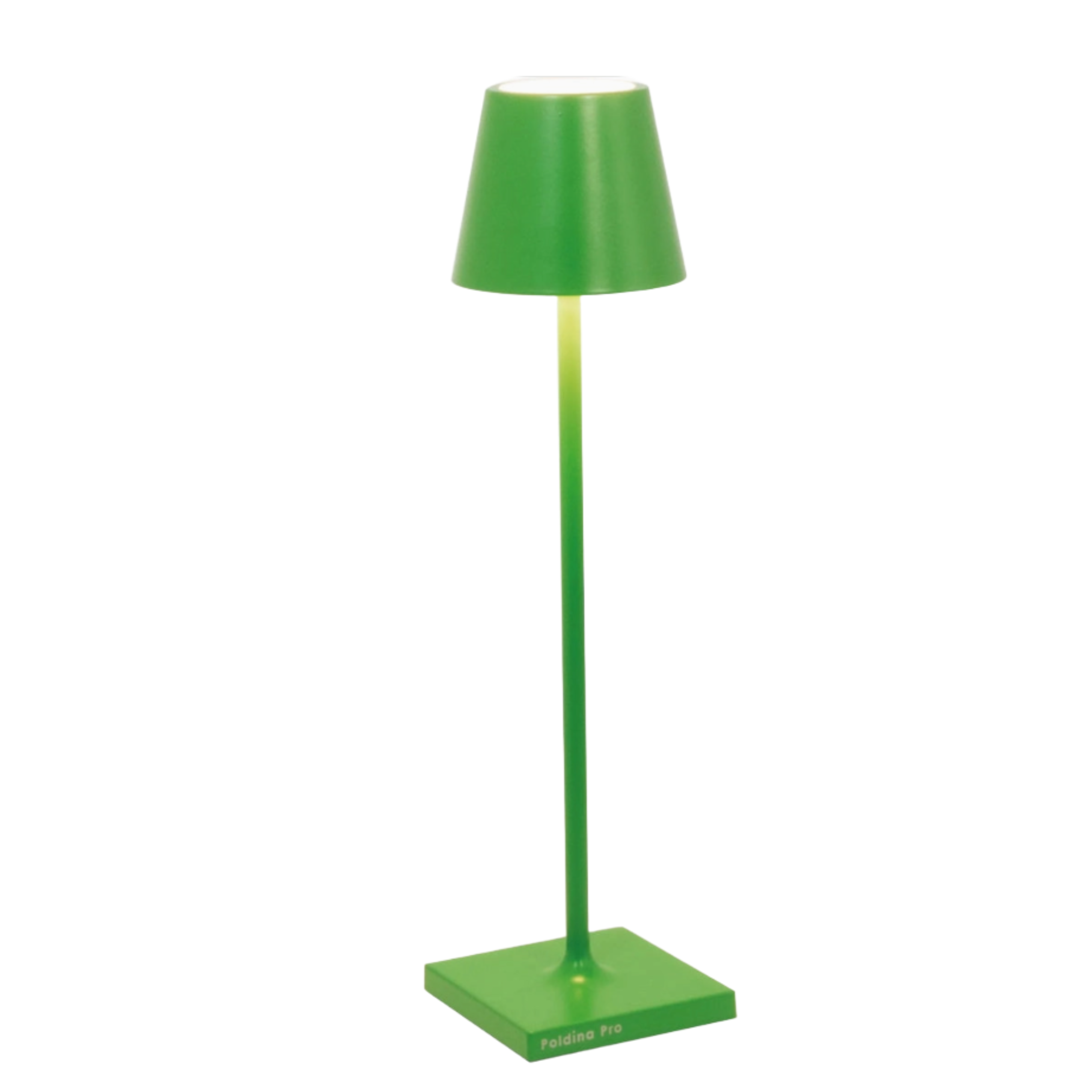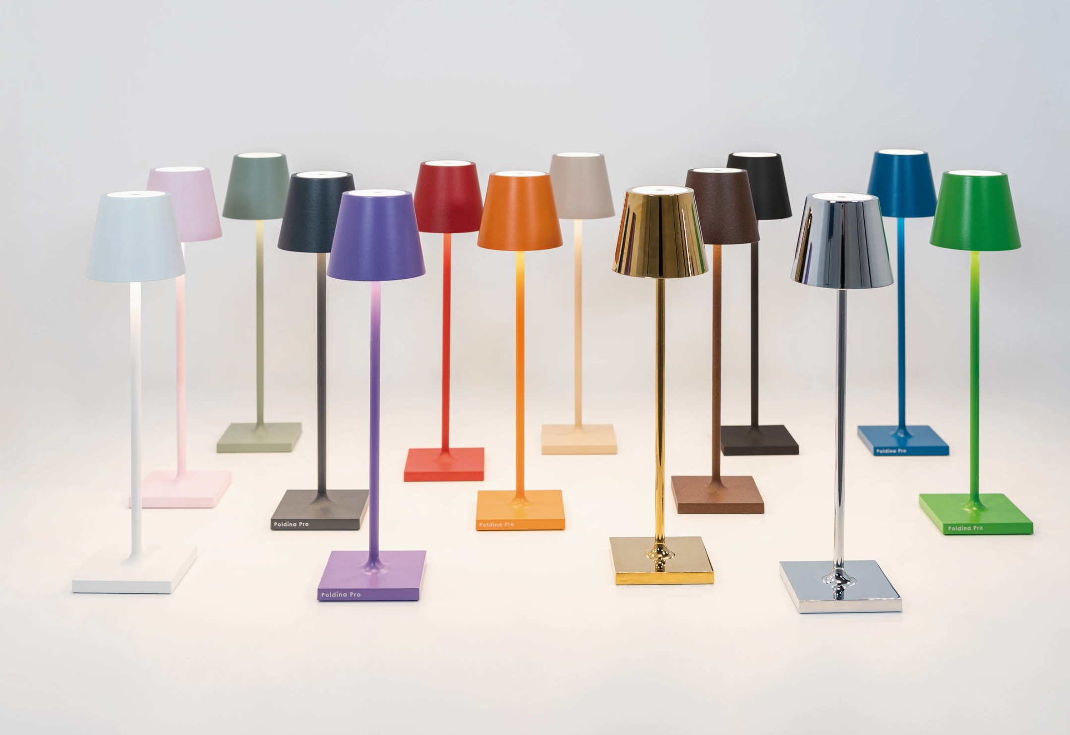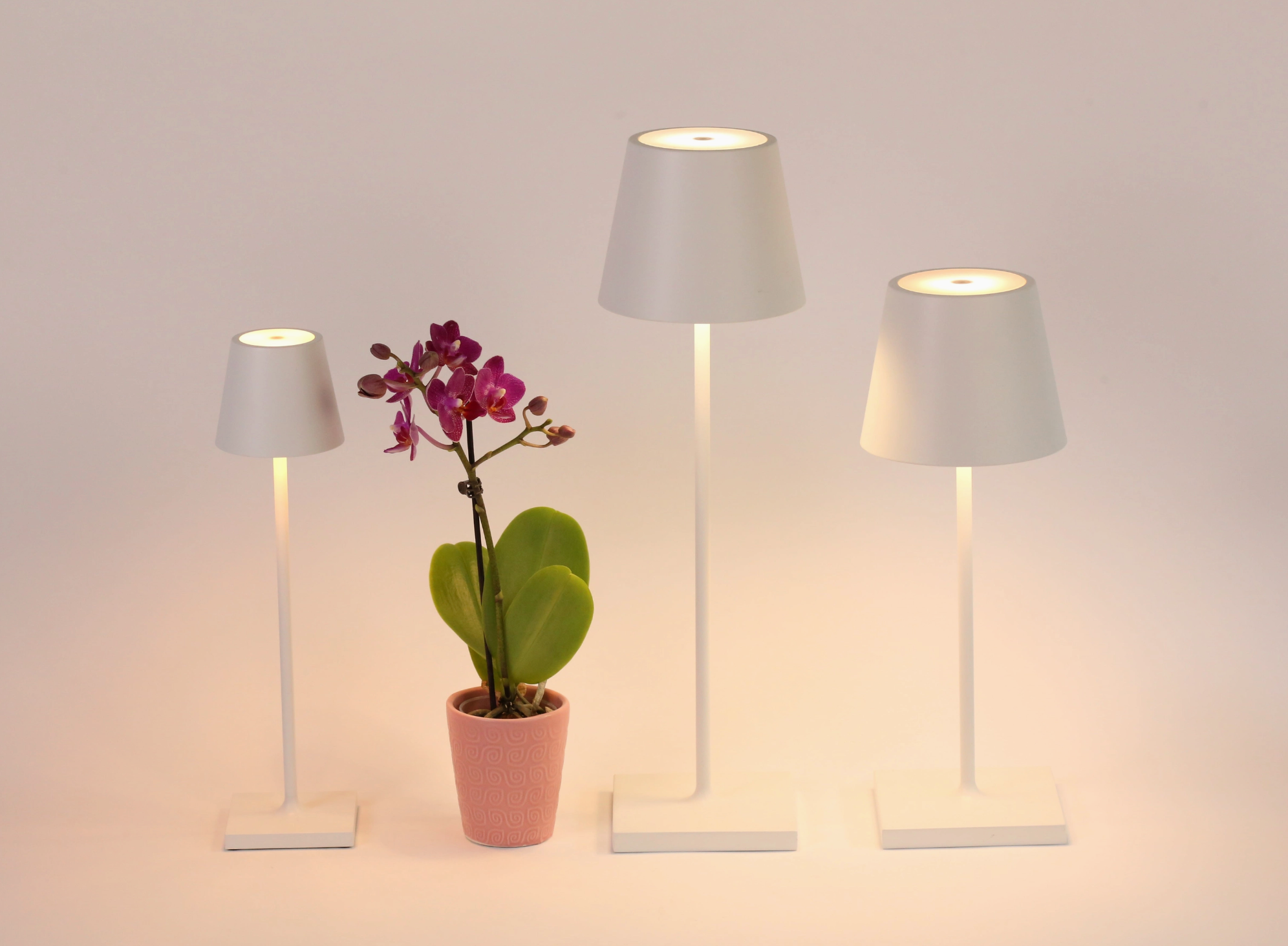Poldina micro is a rechargeable table lamp, with contact charging base, painted aluminum body, polycarbonate diffuser and LED light source. Poldina micro has the same characteristics as Poldina but is reduced in weight and dimensions: in fact, it is only 27.5 cm high and has a diameter of 7 cm.
