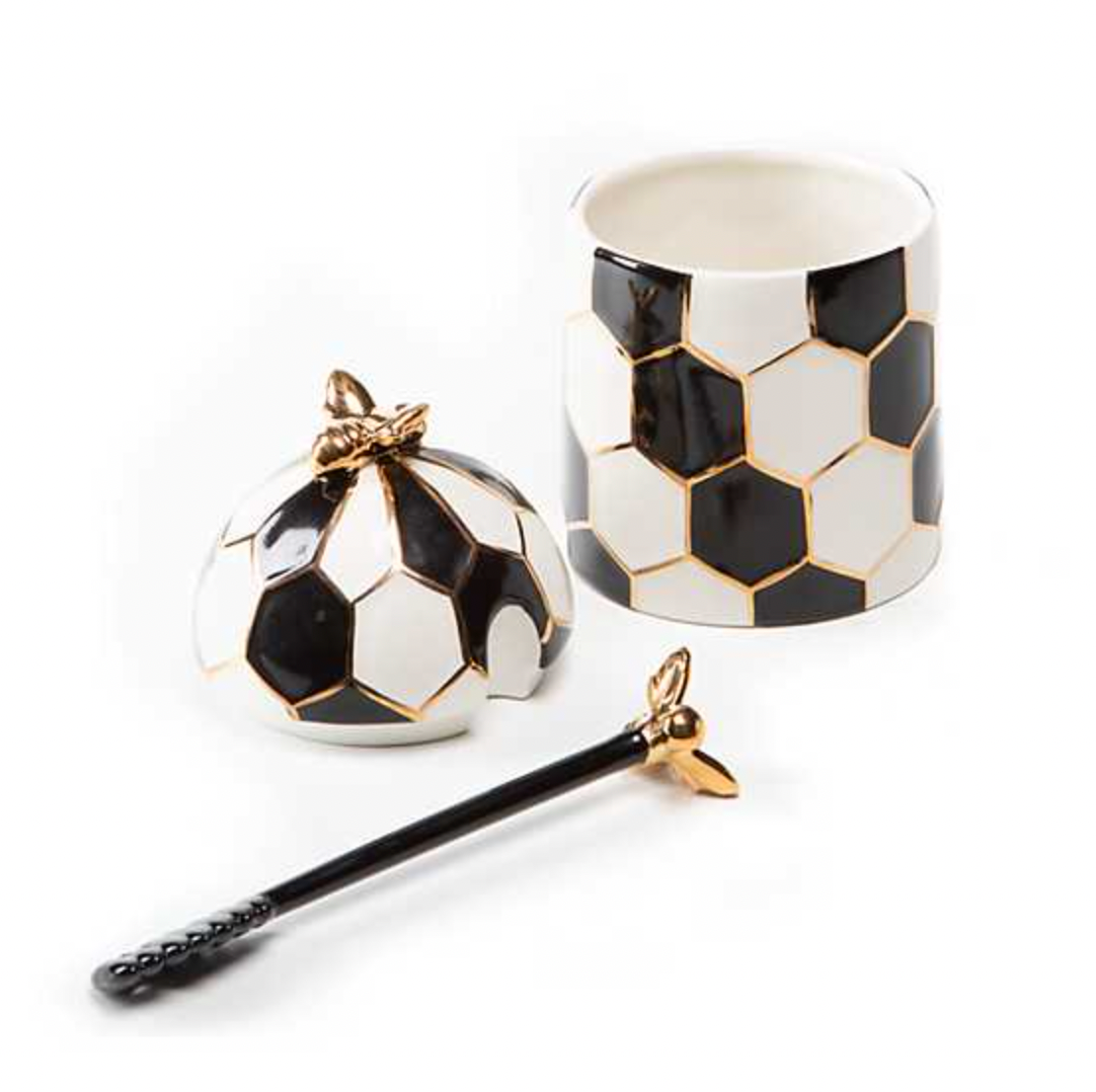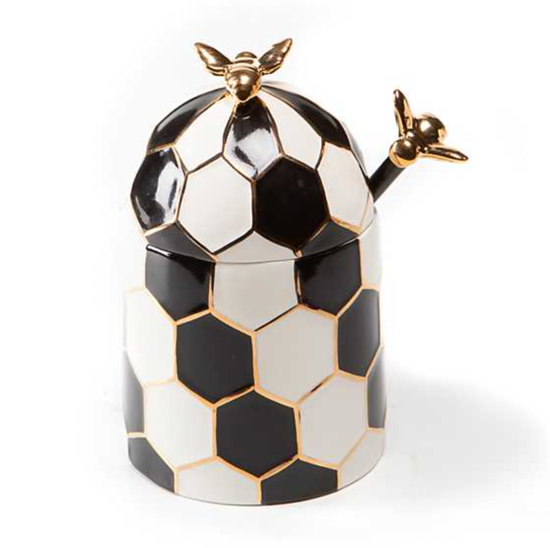 The ceramic Queen Bee Honey Pot serves with style. Decorated in a modern black and white hive pattern, trimmed with gold lustre, it’s embellished with buzz-worthy bees on the top and on its stirrer stick.