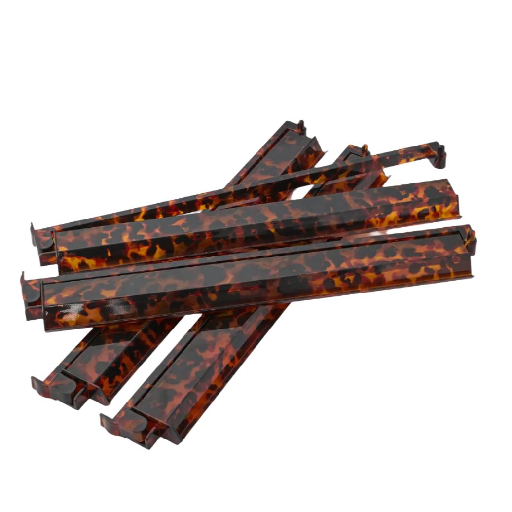 Each set includes four tortoise shell-esque acrylic racks with attached pushers, offering both practicality and a touch of luxury. With a stack length of 18.5 inches, these racks are designed for easy handling and sleek presentation.