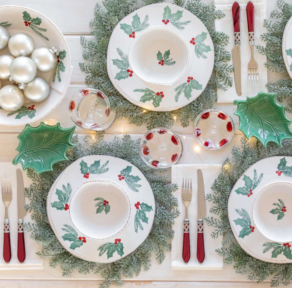 The Lastra Evergreen Large Shallow Serving Bowl features handpainted greenery and holly berries on a rich white background. The classic holiday color palette feels fresh on the rustic, handformed shapes, and the collection is at once elegant, artistic, and joyous.