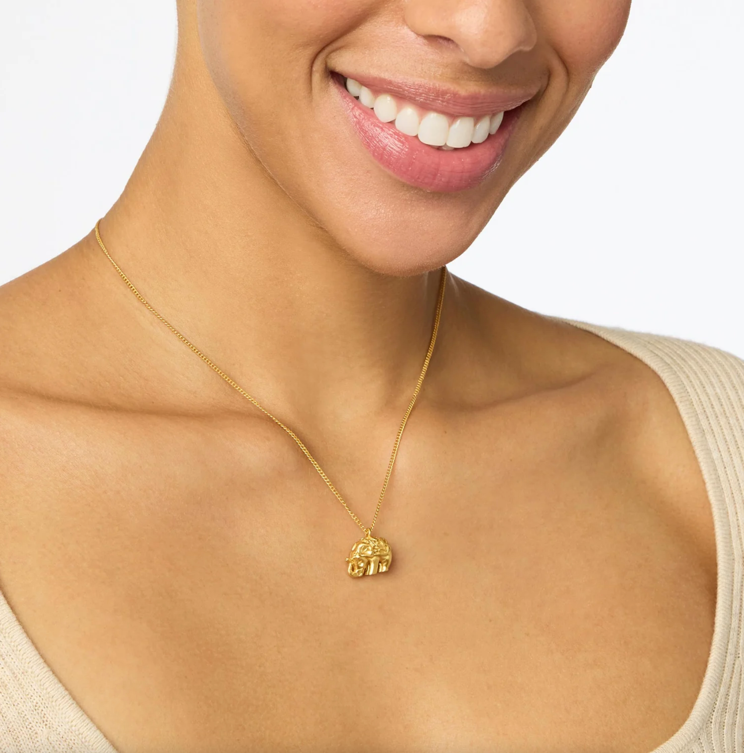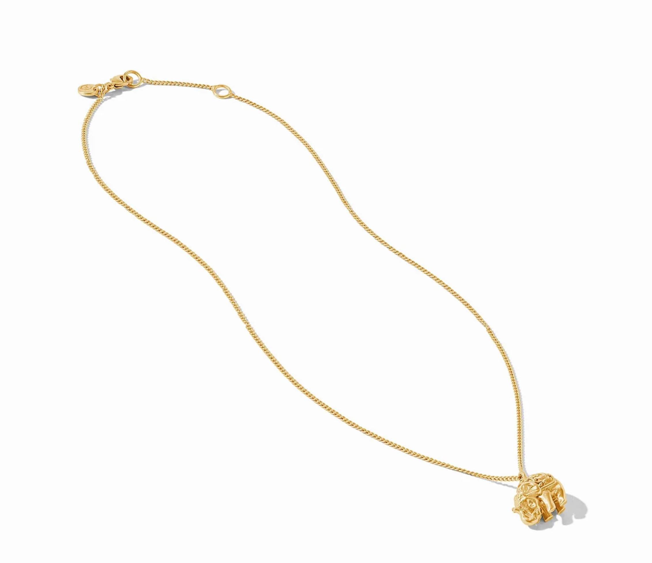 A lifelike golden elephant clad in a richly decorated caparison dangles from a polished curb chain.