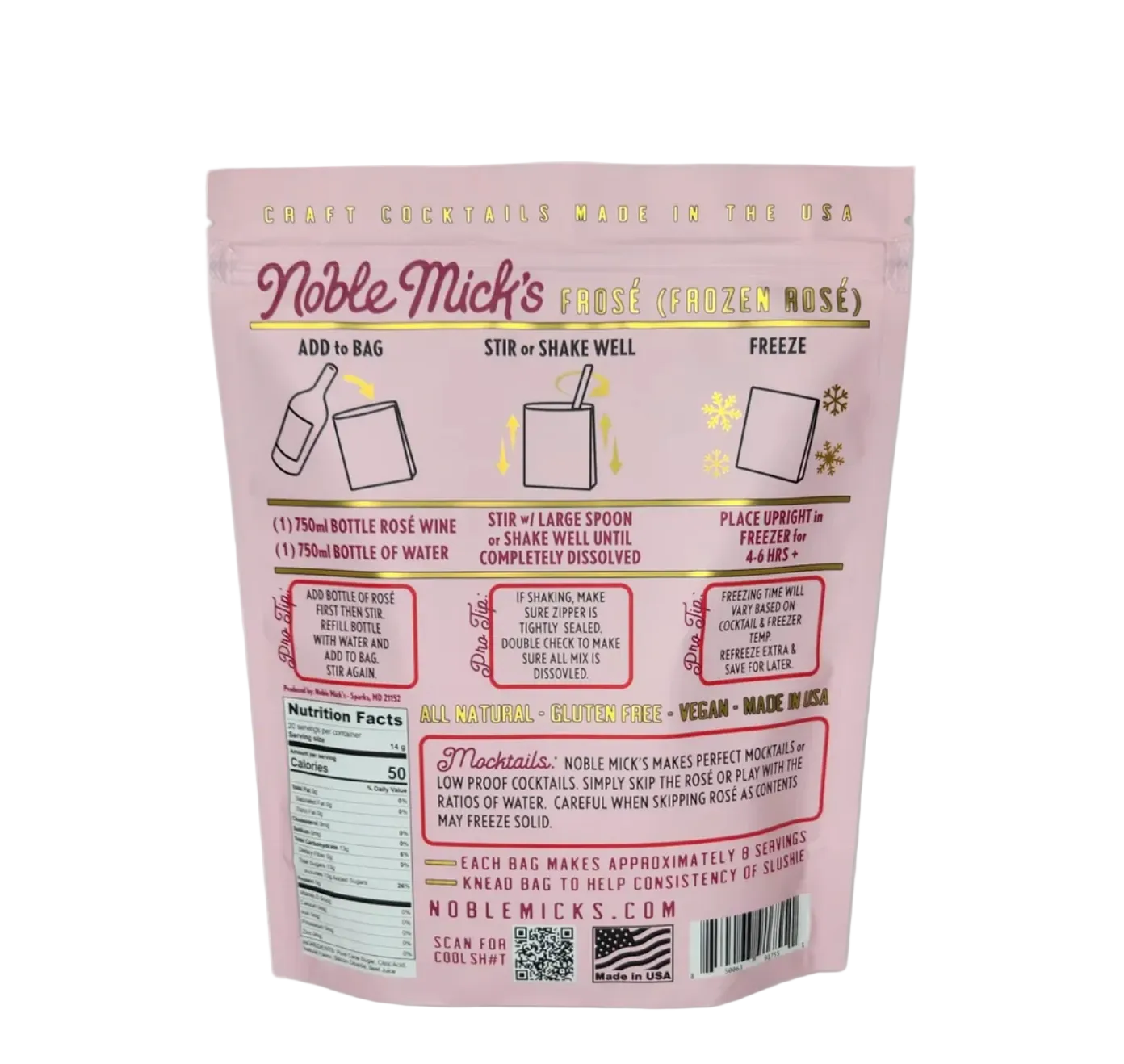 Frozen Cocktails don't get easier than this! Each bag makes 8 servings. No blenders ever! Simply add 1 bottle of Rose' and 1 bottle of water, shake or stir and throw in the freezer. Our Frozen cocktails are unique in you ONLY ever add water and spirit...