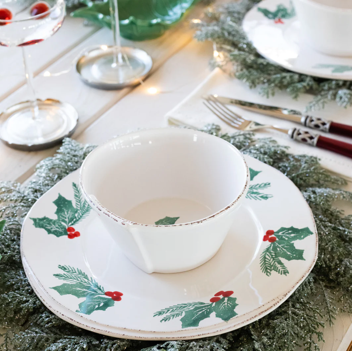The Lastra Evergreen European Dinner Plate features handpainted greenery and holly berries on a rich white background. The classic holiday color palette feels fresh on the rustic, handformed shapes, and the collection is at once elegant, artistic, and joyous.