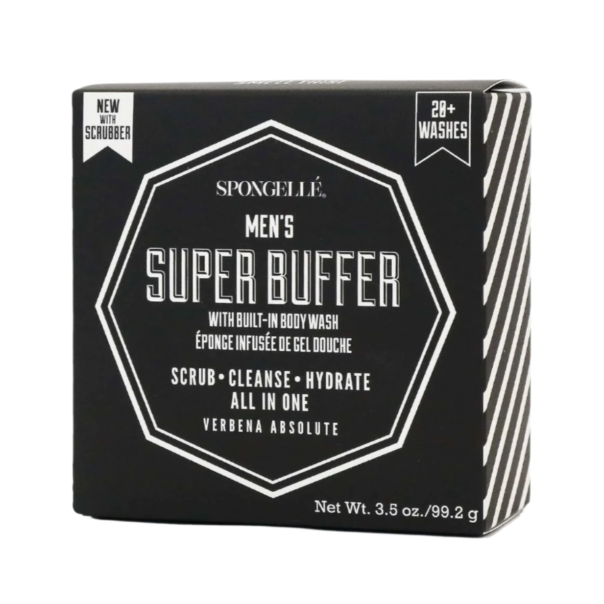Introducing our enhanced Men's Super Buffer, now featuring an innovative dual-sided black scrubber for an invigorating and effective exfoliation experience. This all-in-one men’s cleansing treatment contains energizing extracts for a stimulating clean, deep exfoliation, amplified hydration, and increased circulation for up to 20+ washes.