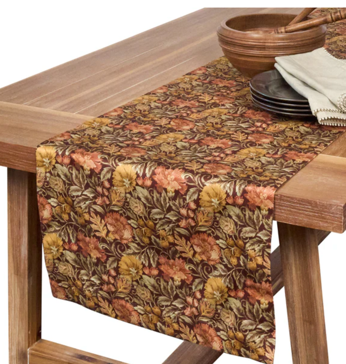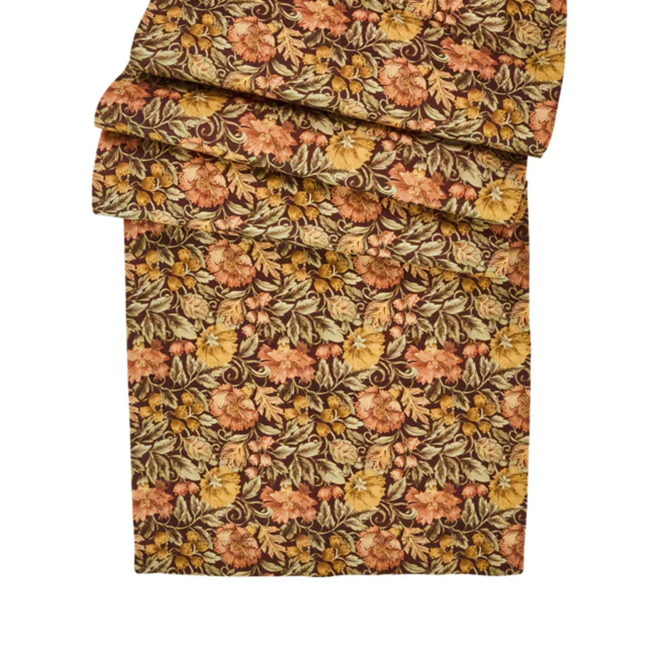 Inspired by heirloom textiles, a fantasy of romantic florals and intertwining leaves in earthy tones compose this tablecloth that evokes the natural elegance, richness, and abundance of a meadow at golden dusk.