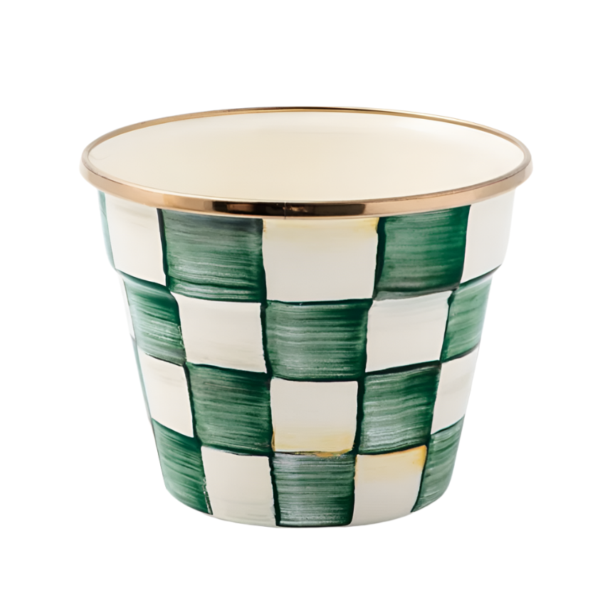Who doesn’t need a useful pot to put things in? The sturdy steel underbody of our enamel Small Emerald Check® Enamel Garden Pot is hand-painted with color-dragged checks and rimmed in bronzed stainless steel. For plants, naturally, but also as an impromptu ice bucket or to store rolled towels in the bathroom. This pretty pot shines with the high-contrast gloss of our most popular pattern, making it a perfect complement to any decor.