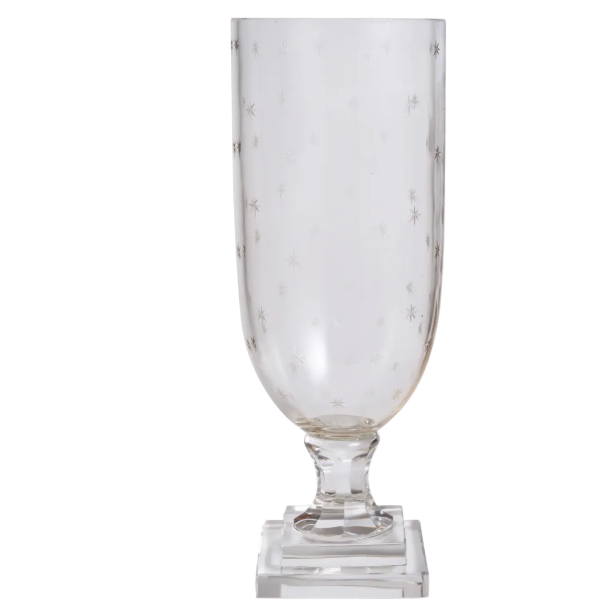 This etched glass hurricane showcases refined craftsmanship with its intricate etched star motif, designed to serve multiple purposes in your home. The transparent glass construction allows candlelight to refract elegantly through the etched details, while its generous opening accommodates both pillar candles and fresh botanical arrangements. The hurricane's classic proportions provide wind protection for open flames and create an ideal microclimate for extending the life of cut flowers. A sophisticated addition to any interior, this piece demonstrates the enduring appeal of functional glassware that seamlessly transitions between decorative and practical applications.