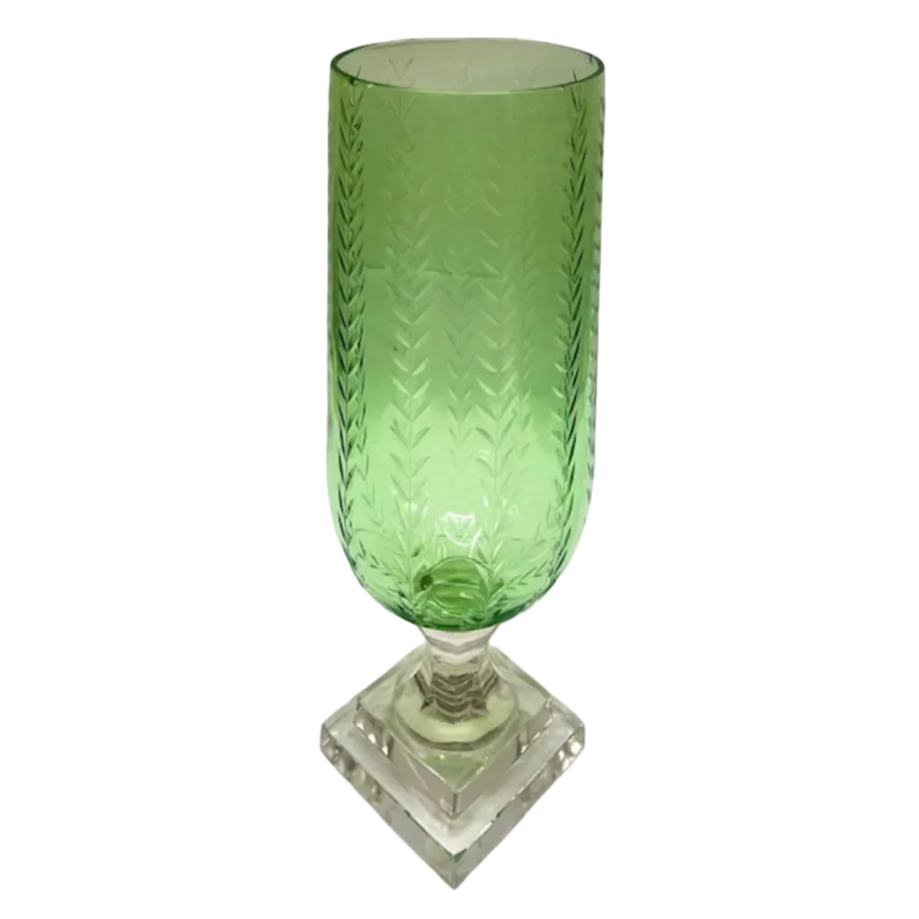 Hand Crafted, Mouth Blown Green Glass Vertical Leaf Design Hurricane