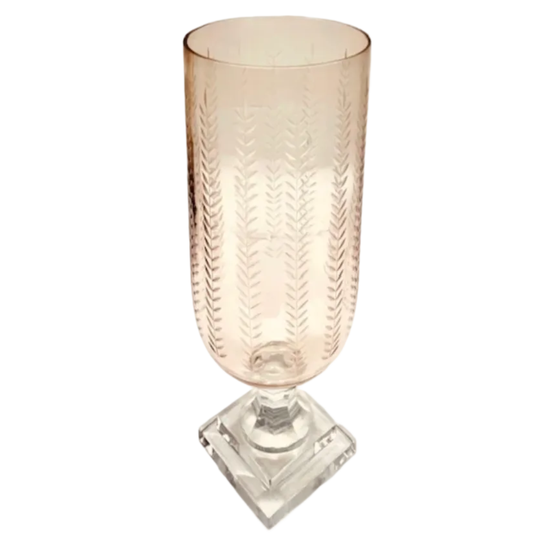 This etched glass hurricane showcases refined craftsmanship with its intricate vertical leaf motif, designed to serve multiple purposes in your home. The light pink glass construction allows candlelight to refract elegantly through the etched details, while its generous opening accommodates both pillar candles and fresh botanical arrangements. The hurricane's classic proportions provide wind protection for open flames and create an ideal microclimate for extending the life of cut flowers. A sophisticated addition to any interior, this piece demonstrates the enduring appeal of functional glassware that seamlessly transitions between decorative and practical applications.