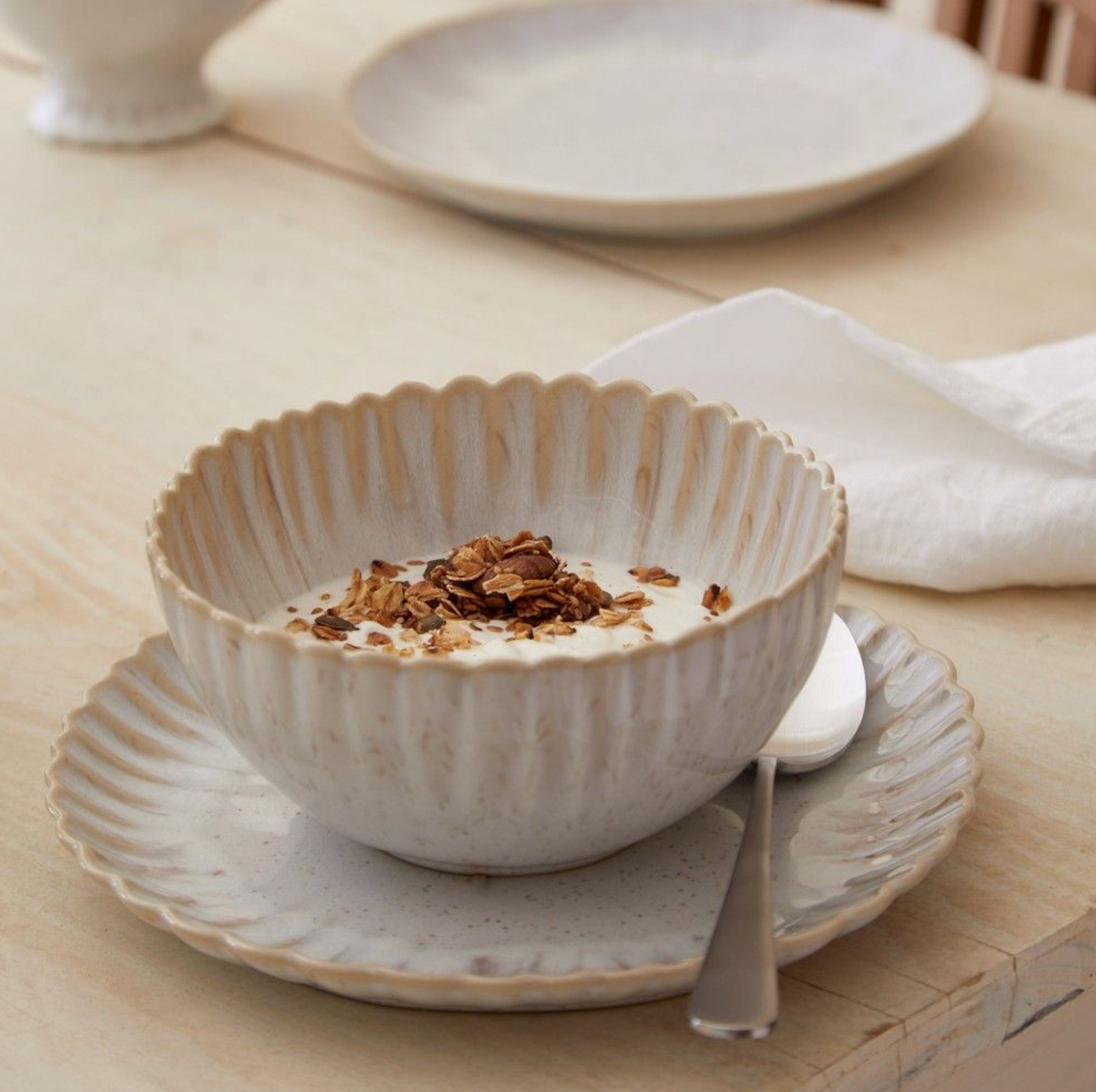 As its name suggests, the Mallorca collection captures the natural landscape of the famous Mediterranean island, a haven of turquoise waters, soft golden sands, and impressive cliffs. Mallorca shares its DNA with our Eivissa collection, featuring spectacular reactive glazes of beige sand and sea blue patterns. Yet, its soft and undulating edges suggest a more exquisite look. Combine both shapes for a casual and surprising setting.