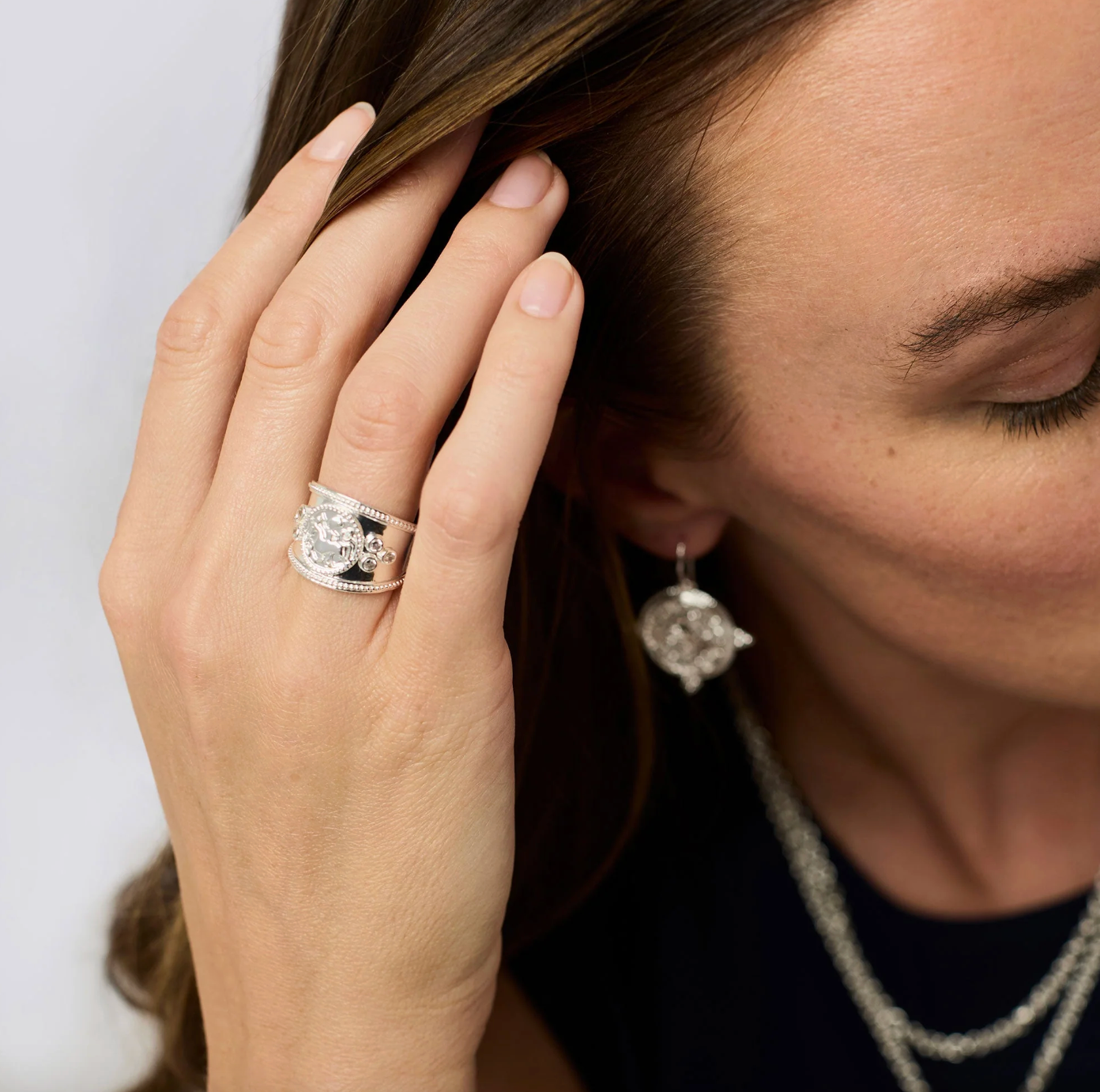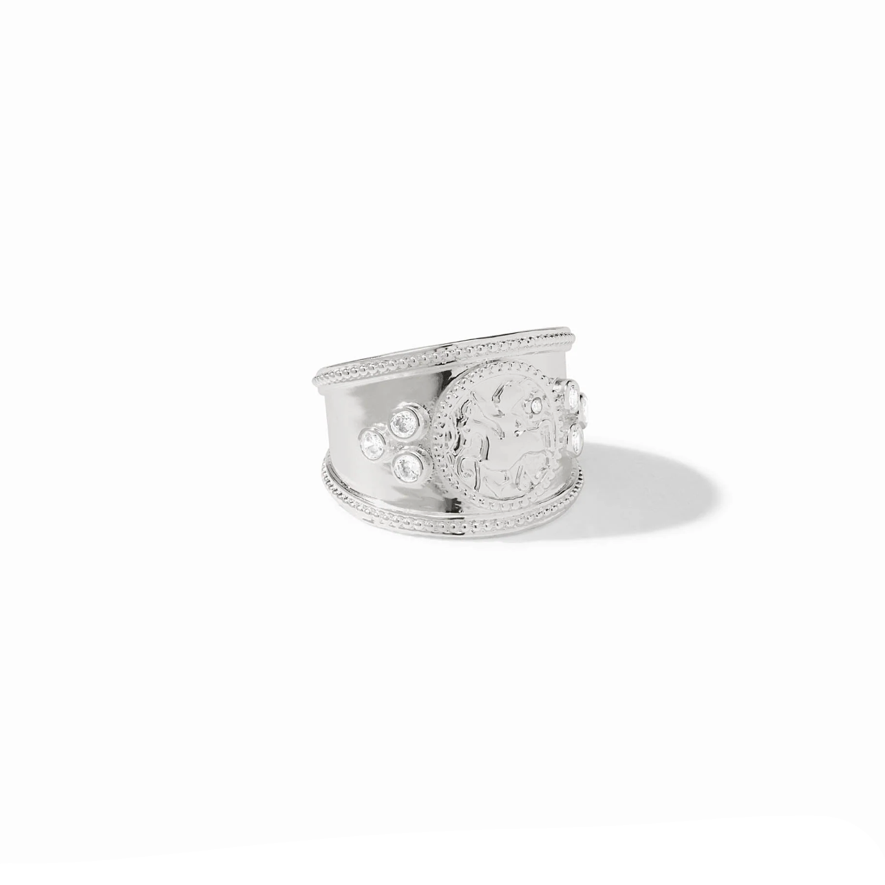 A classically-inspired crest ring showcasing a bas relief knight on horseback with trefoils of brilliant-cut gemstones flanking the central coin.