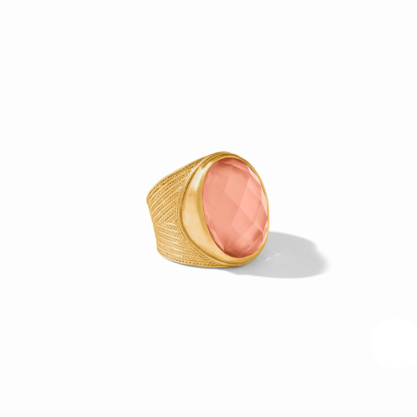 Radiant gemstone of richly hued rose-cut glass and mother of pearl, decorated with rows of elegant chevron detail on the tapered shank.