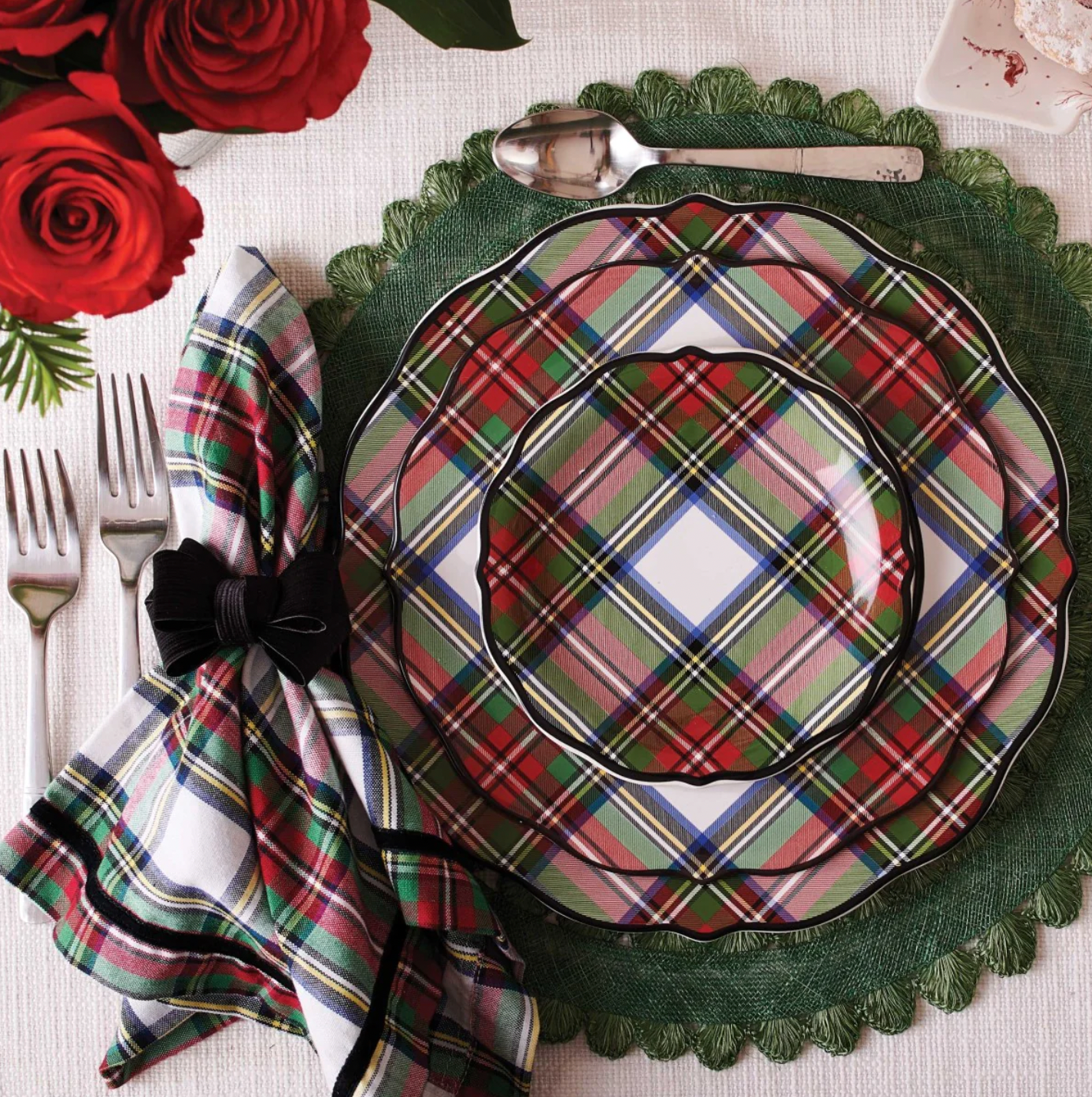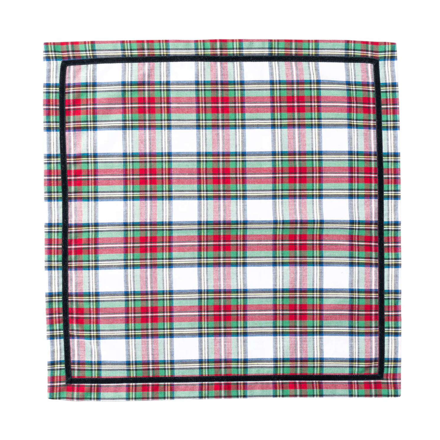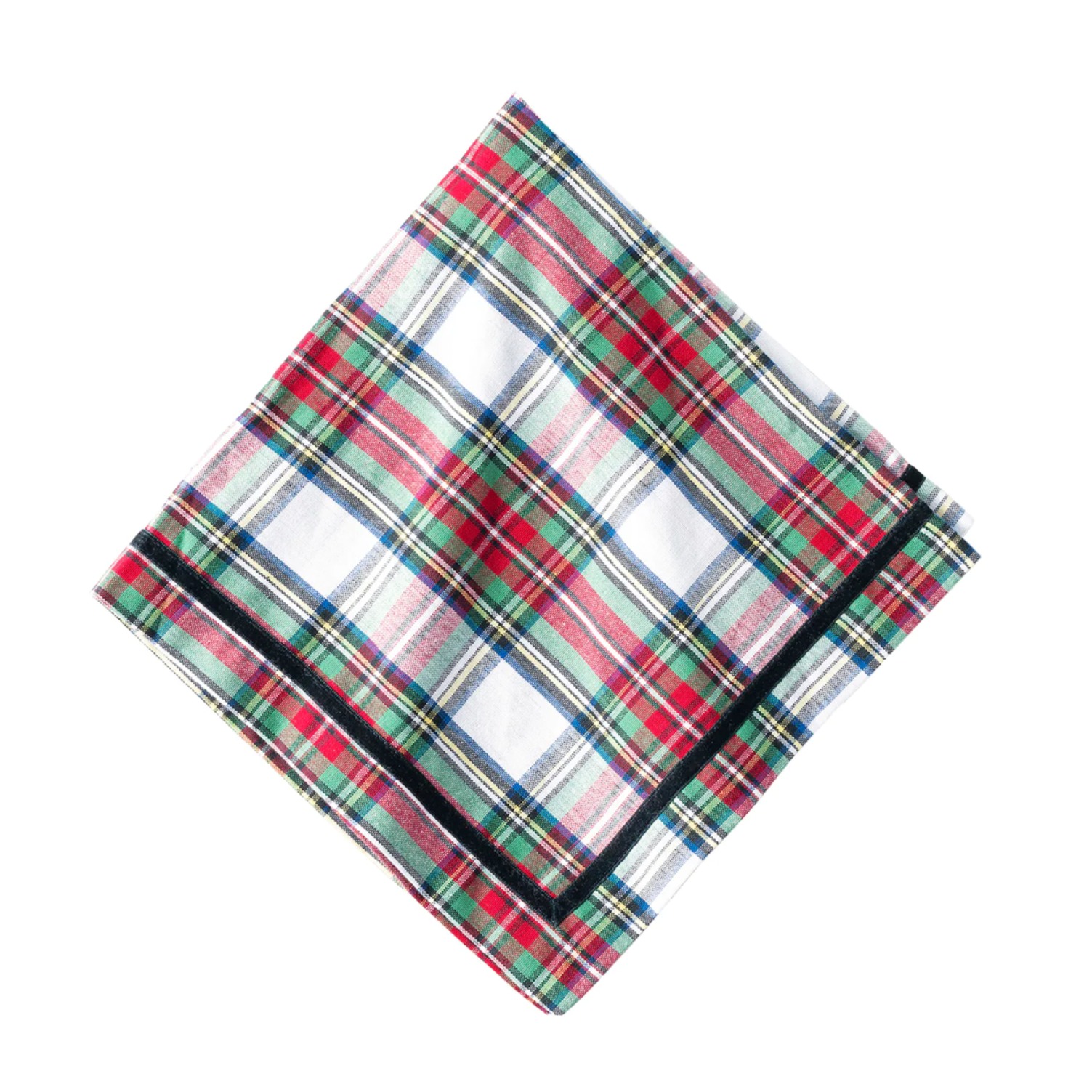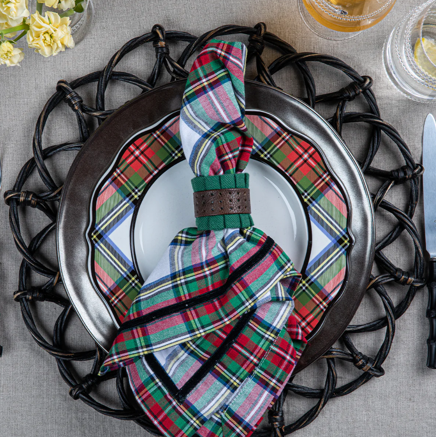 From the Stewart Tartan Collection. We adore the festive flair of tartan. This new woven napkins, trimmed with a black velvet ribbon, are a dashing companion to your table setting for any occasion, from a happy breakfast to a chic dinner. Pair with your favorite dinnerware to add a touch of dapper elegance.